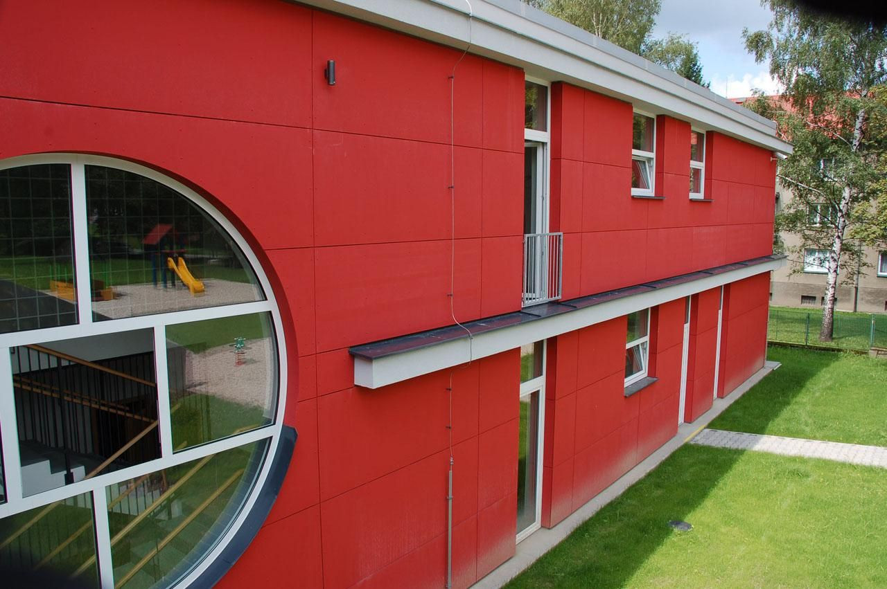 Specifickou kapitolou jsou rekonstrukce a s tím spojené zateplení obvodového pláště budov škol a mateřských školek. Volba provětrávané fasády spolu s obkladem vláknocementovými fasádními deskami přináší při rekonstrukci těchto zařízení řadu výhod. Jednou z nich je možnost snadné údržby a také odolnost desek jako takových. Pohyb v okolích školských zařízení dokáže být pro novou fasádu zatěžkávací zkouškou. Při aplikování kontaktního zateplovacího systému s finální omítkovou vrstvou jsme nezřídka svědky řady poškození v oblasti soklu, kde fasáda odolává nevinným dětským míčovým hrám apod. V tomto směru se můžeme na fasádu z vláknocementových desek spolehnout. V případě, že by došlo k vážnějšímu poškození, řeší se pak výměna konkrétní desky bez nutnosti rozsáhlejší sanace fasády. Jak jsme již zmiňovali v úvodu, použití systému větrané fasády pozitivně ovlivňuje i klima v interiéru, na kterém by mělo obzvláště v případě školských budov záležet. Akustický útlum je zase velmi podstatnou vlastností v případě dalších veřejných budov, jako jsou soudy, knihovny nebo nemocnice.
