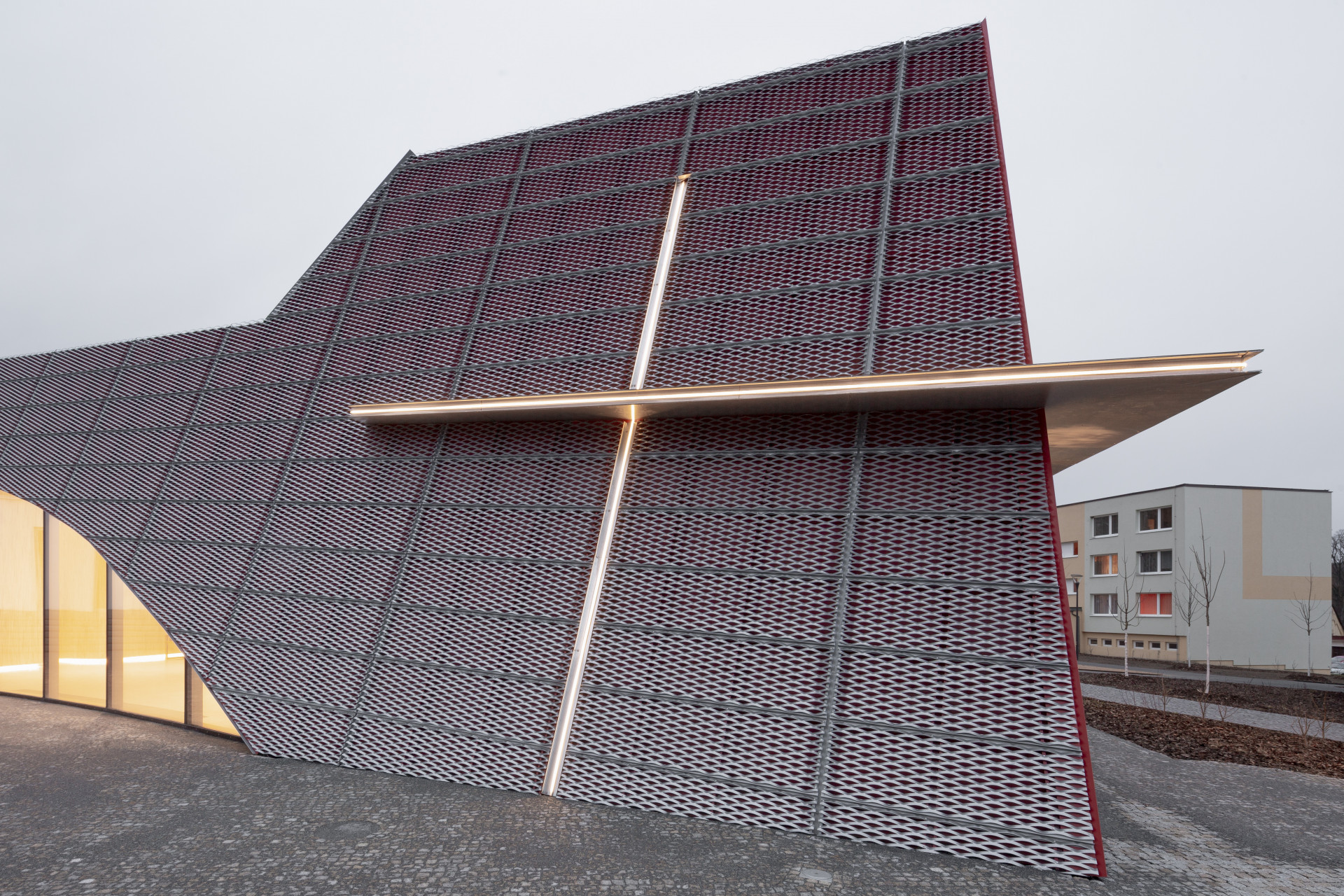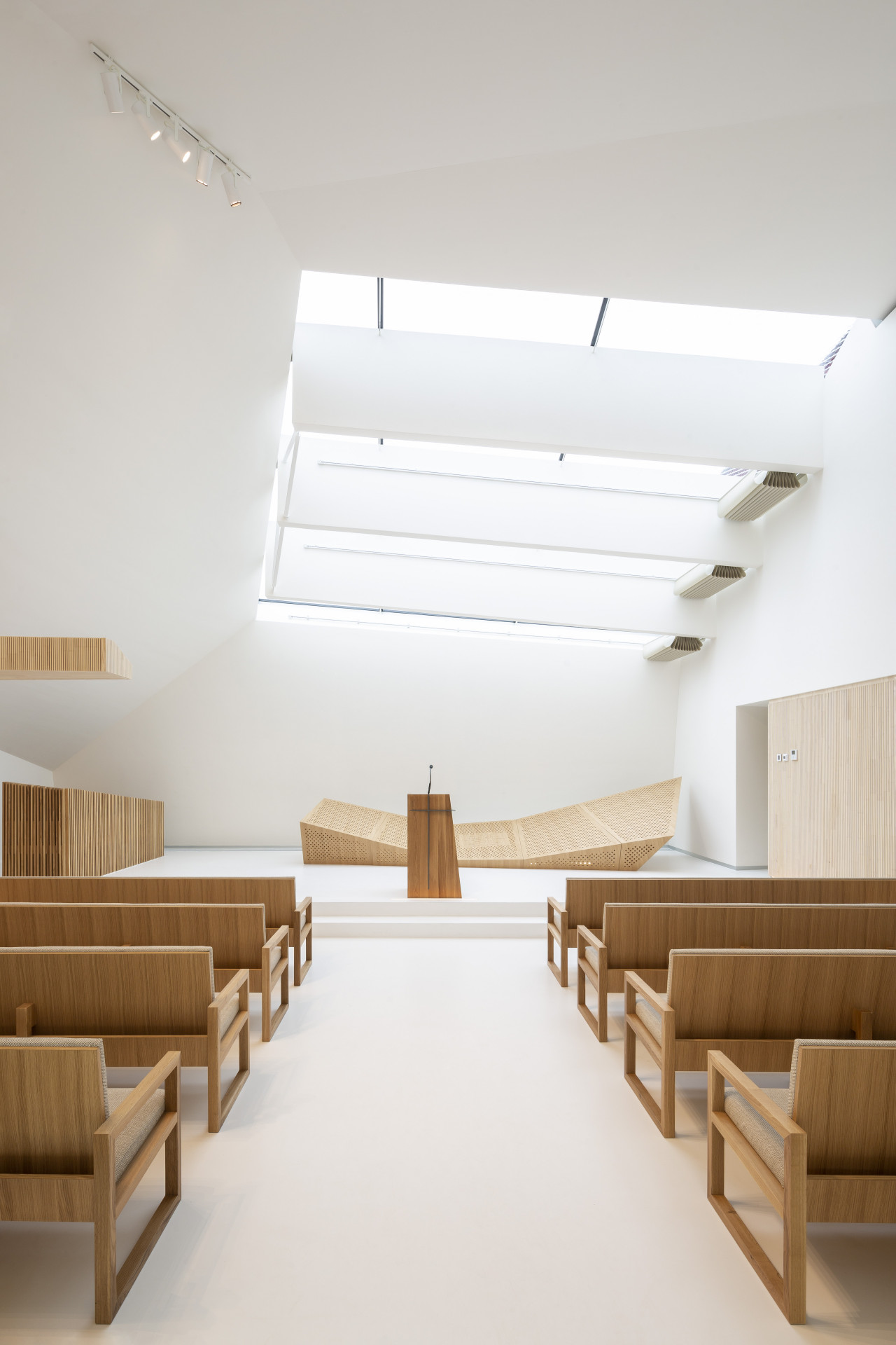 Tvar modlitebny generuje průnik krystalické formy s organickým tvarem křivky. Pevná hmota, složená z jednotlivých ploch a linií a pevně spojená se zemí, má symbolizovat vymezený prostor života. Organický prvek křivky pak představuje spontánnost a dynamiku života. Aby architekti podpořili duchovní rozměr objektu, umístili nad kazatelnu velké prosklené plochy, které v interiéru vytvářejí zajímavé světelné hry.
