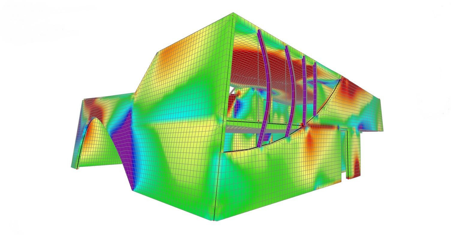 „Po úvodních výpočtech se brzy ukázalo, že nejvýhodnějším konstrukčním systémem bude železobetonová monolitická skořepina. Vzájemné rozepření stěn a desek o tloušťkách 250-280 mm umožnilo vytvořit zastřešení hlavního sálu o půdorysných rozměrech cca 12x17 m bez vnitřních podpor či průvlaků. Monolit se ukázal jako ideální rovněž pro řešení eliptických oken a sedmi metrové konzoly v případě překonzolované stěny. Monolitické řešení rovněž umožnilo vytvořit množství zkosených ostění a detailů pro návaznosti na kompletační konstrukce dle záměru architektů,“ vysvětluje konstrukční řešení Petr Müller ze společnosti STATIKON.