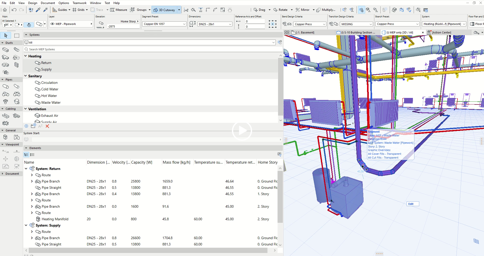 Kromě úvodních výpočtů pro vzduchotechniku jsou k dispozici výpočty topných systémů. Pro ty lze nastavit kritéria jako jsou topný výkon a teplota vracející se vody. Lze vytvářet systémové skupiny, což umožňuje snadnou organizaci všech typů potrubních systémů. Instance každého systému lze bez námahy třídit a jednotlivě pojmenovávat, např. Přívod tepla. Systém je zobrazen jako hierarchická stromová struktura. Po nastavení hydroniky, jako jsou směr proudění, teplota přívodu a odvodu, systém provede výpočet v reálném čase a zobrazí výsledky, jako jsou kapacity, hmotnostní průtoky, teploty a rychlosti.