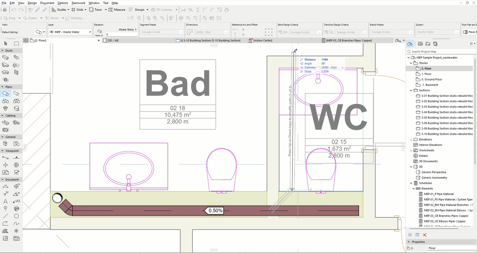 Spád je neodmyslitelnou vlastností potrubní trasy. Volba „Zobrazení na obrazovce" ukazuje hodnotu a směr spádu. Nastavení spádu se automaticky dědí po připojených trasách, není třeba je znovu nastavovat. Pomocí funkce „Upravit“ lze připojit šikmou trasu ke svislé. Nastavení spádu funguje v kombinaci s modrými vodicími čarami. Lze tak snadno ručně vytvářet připojení i v případě složitějších situací. Je také možné vybrat všechny vodorovně propojené trasy najednou a následně jim změnit spád. Všechny spoje zůstanou nedotčené, což si lze ihned zkontrolovat ve 3D.