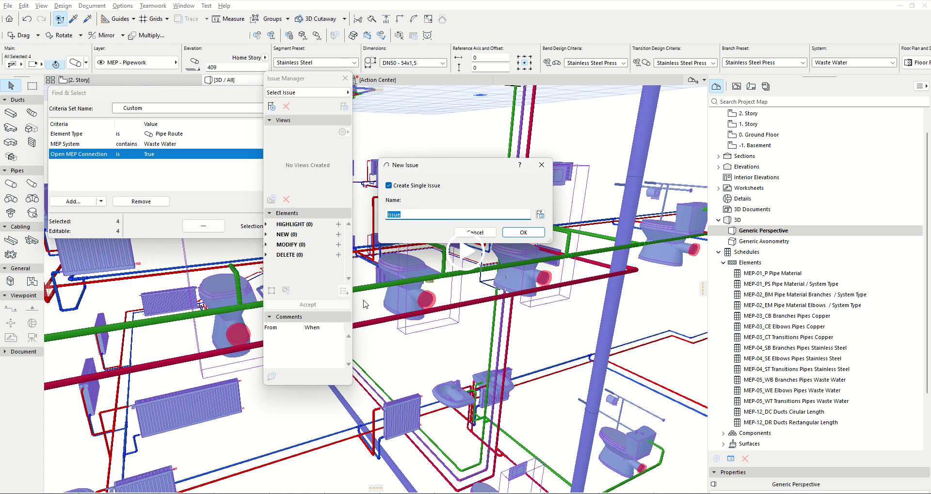 Pro bezchybné systémové výpočty je nezbytné rozpoznat otevřená zakončení tras a dalších prvků TZB. Pomocí nástroje "Najít a vybrat" lze rychle identifikovat otevřené konce. Pakliže se chceme zaměřit na konkrétní trasu, zadáme příslušná kritéria. Systém zjistí, kolik problémů existuje a zobrazí je ve Správci anotací. Každý konkrétní problém si lze následně přiblížit a snadno opravit.