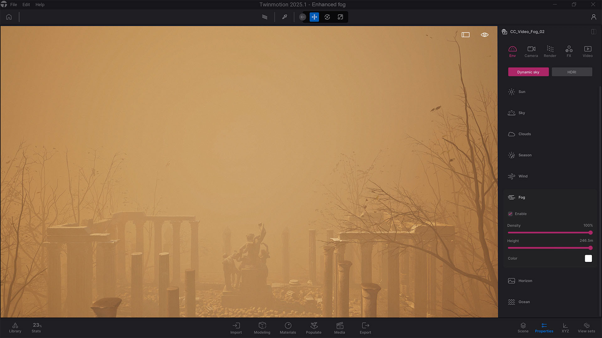 Někteří uživatelé snižují úroveň terénu výrazně pod z=0, aby mlhu „zahustili“. Navíc aktuálně není možné přidat detailně nadefinovanou mlhu do pozadí nebo ji přesně umístit ve scéně. Proto přibyly další parametry pro její nastavení, výška, počáteční vzdálenost mlhy a barva rozptylu.