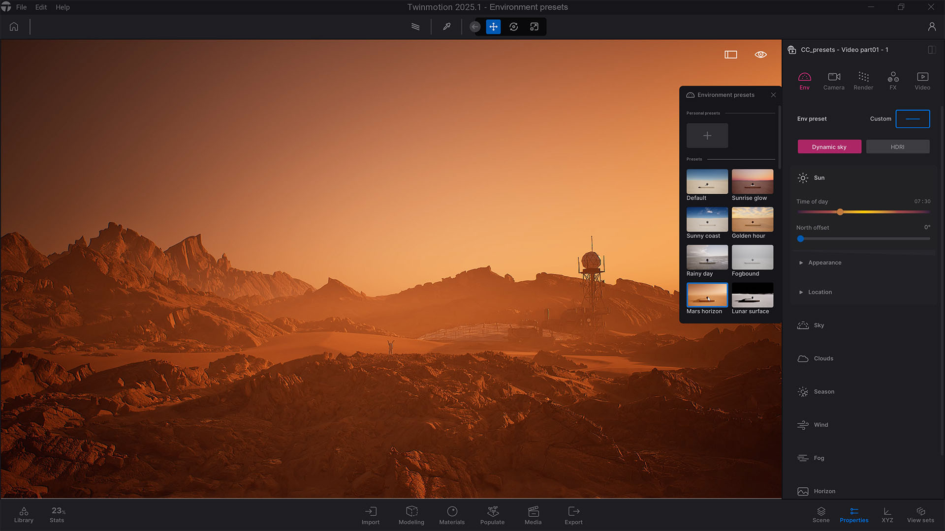 Sadu přednastavení prostředí lze rychle aplikovat do scény. Kdo by nechtěl rychle dotvářet atmosféru zobrazované scény? Avšak je nutno upozornit na skutečnost, že předvolby jsou uloženy lokálně a nelze je snadno sdílet s ostatními uživateli.