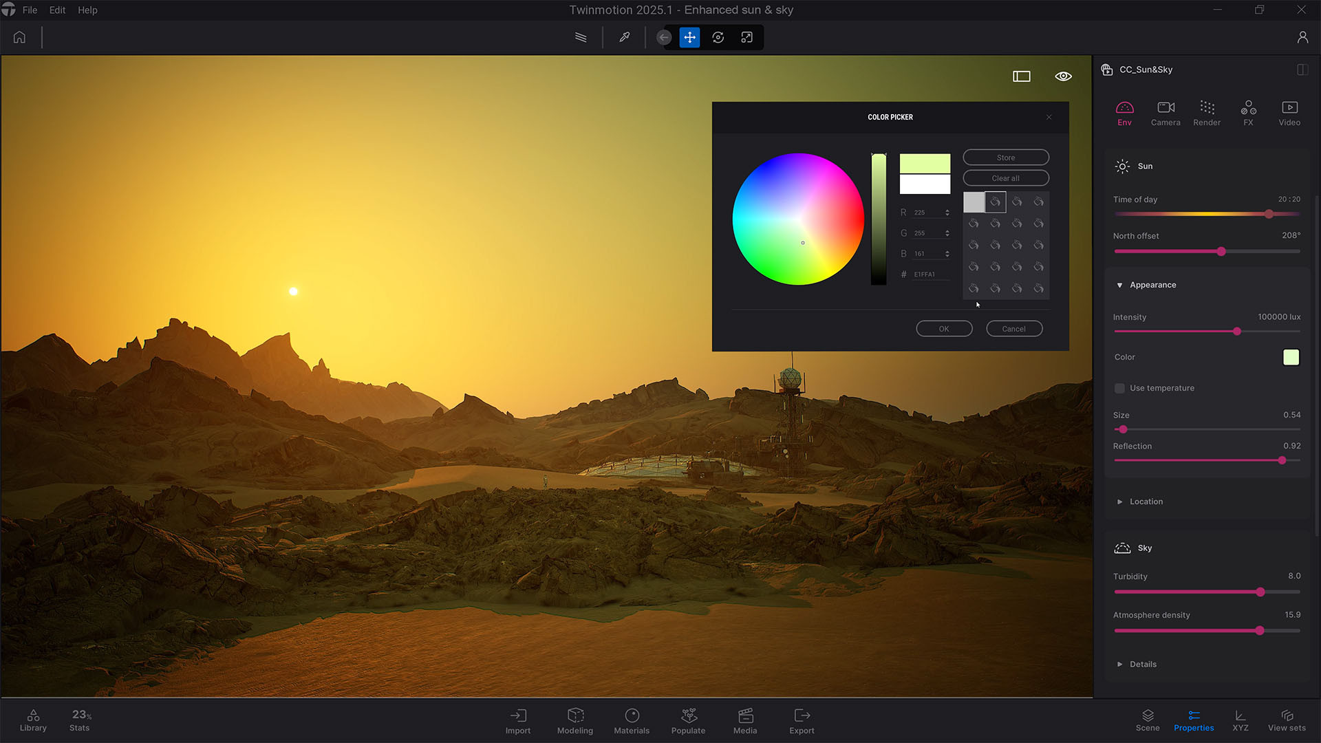 Byla přidána dvě nastavení: „znečištění“ (turbidity) a hustota atmosféry. Znečištění může změnit jas oblohy a simulovat tak příšeří způsobené značným množstvím velkých částic vznášejících se ve vzduchu. Nastavení hustoty atmosféry ovlivňuje barvu oblohy tím, že simuluje vše od neexistující až po řídkou nebo velmi hustou atmosféru, což má vliv na rozptyl světla různých vlnových délek. Navíc lze nyní změnit barvu nebo teplotu slunce nebo směrové světlo v režimu HDRI.