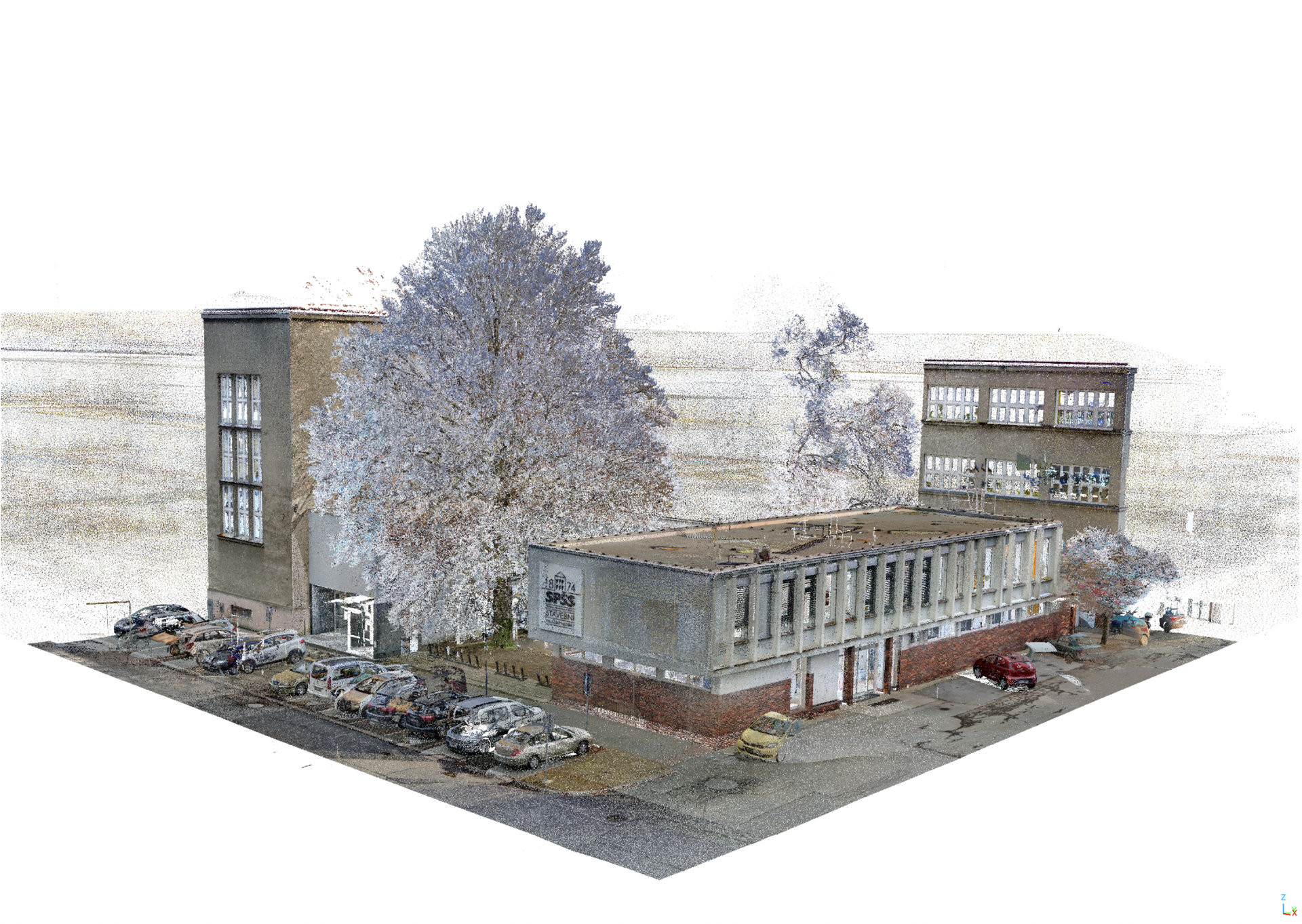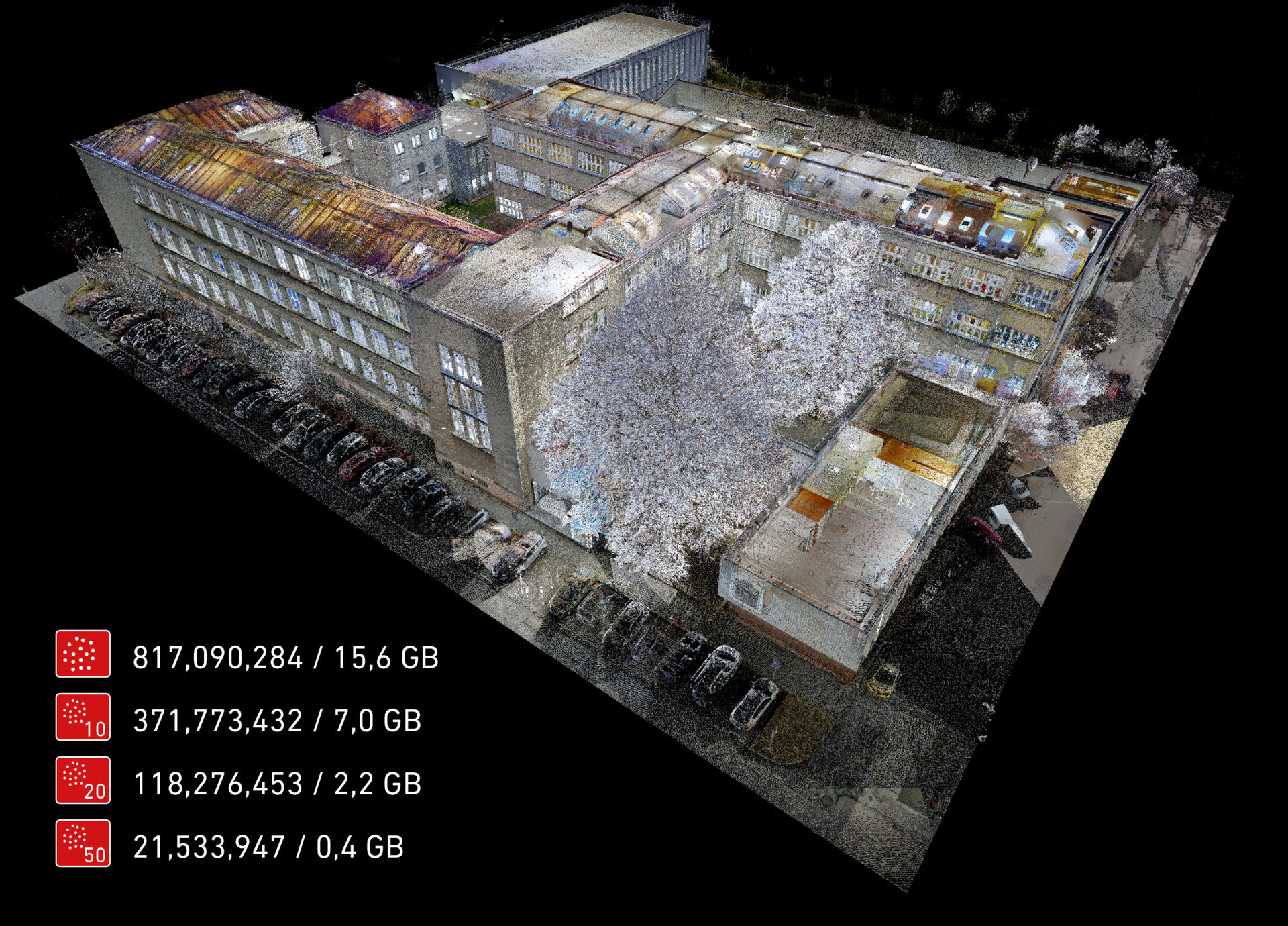 Mračno bodů exteriéru celé budovy včetně interiérů v neredukovaném rozlišení obsahovalo 817+ milionů bodů o velikosti souboru 15,6 GB. Nastavením parametru naředění na 10, 20, případně 50 mm se velikost mračna výrazně zmenšila a výrazně lépe se s ním pracovalo.
