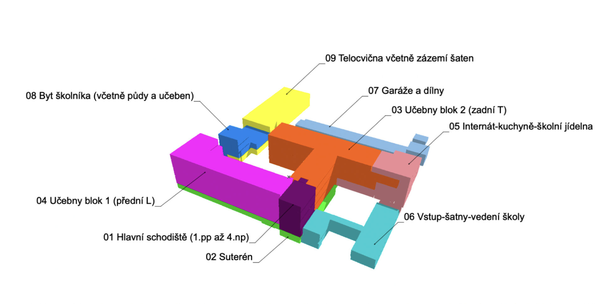 Na základě definovaného zjednodušeného plánu realizace BIM jednotlivé týmy zpracovali všech 9 částí objektu střední školy. Díky definovanému, byť zjednodušenému standardu bylo dosaženo kompaktního výsledku v podobě 3D/BIM modelu školy, ze kterého bylo následně možné generovat 2D dokumentaci stávajícího stavu.