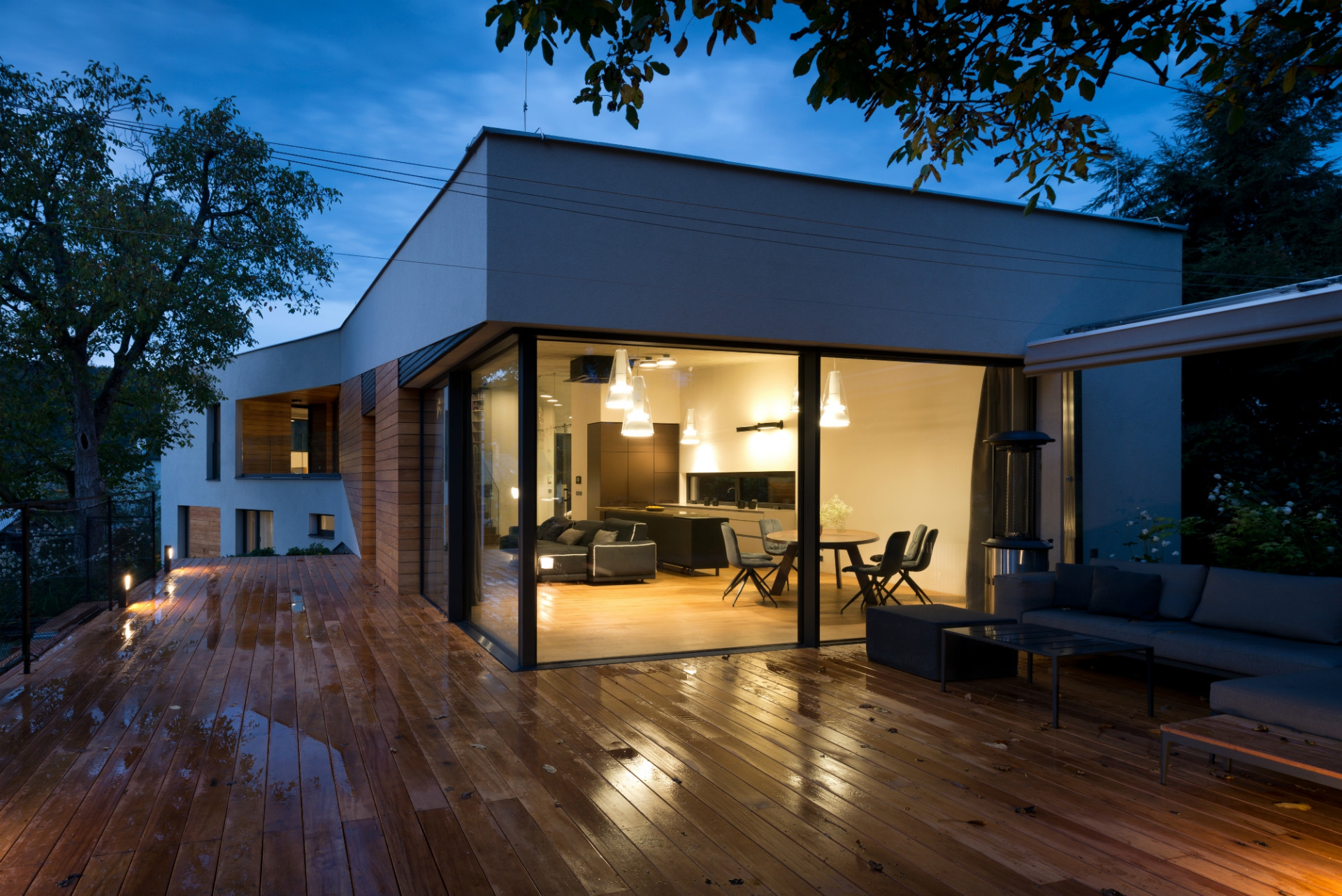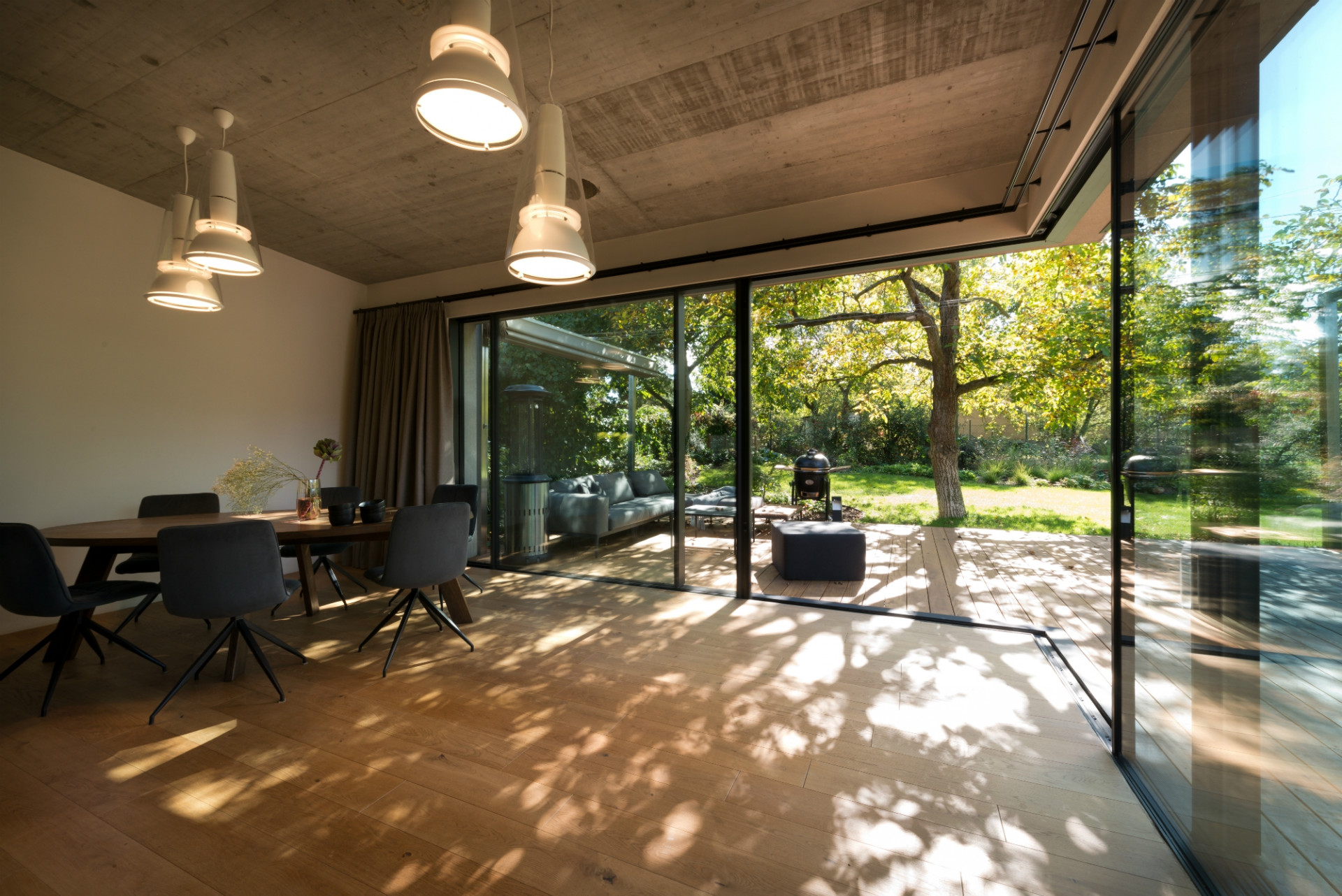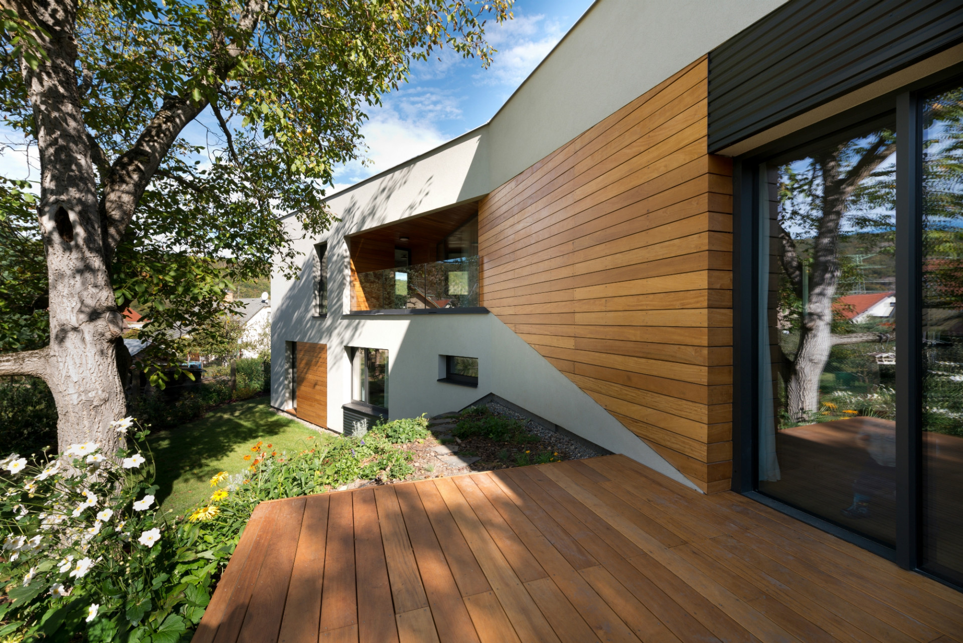 „Bylo to stavebně zajímavé, ale staticky náročné. Několikrát jsme to přepočítávali a měnili, nakonec jsme vytvořili obrovskou atiku se spoustou železa, aby nedošlo k průhybu stropního betonu ani o dva centimetry a okna nepraskla. Vznikl tím však krásný výhled, kdy se vám otevře zahrada a vy sedíte u jídelního stolu v obývacím pokoji a vlastně i v zahradě. Váš výhled přitom nic neruší, ani ten nejtenčí sloupek, takže vůbec nevnímáte, že sedíte uvnitř,“ líčí architektka, jaké pocity asi prožívají obyvatelé domu, když otevřou prosklený roh z posuvných křídel Schüco ASS 77 PD.HI - samozřejmě pohodlně ovládaných skrytým automatickým pohonem, ale i vysoce tepelně izolovaných díky trojsklu HI (High Insulation). Přirozené zastínění vytváří letitý ořech, takže žaluzie ani nebylo třeba.