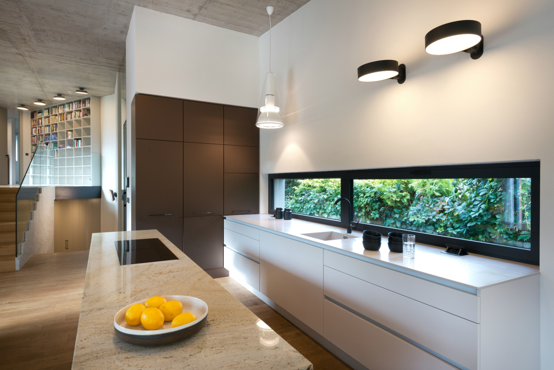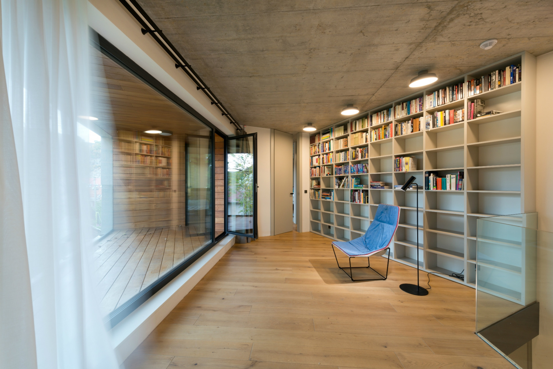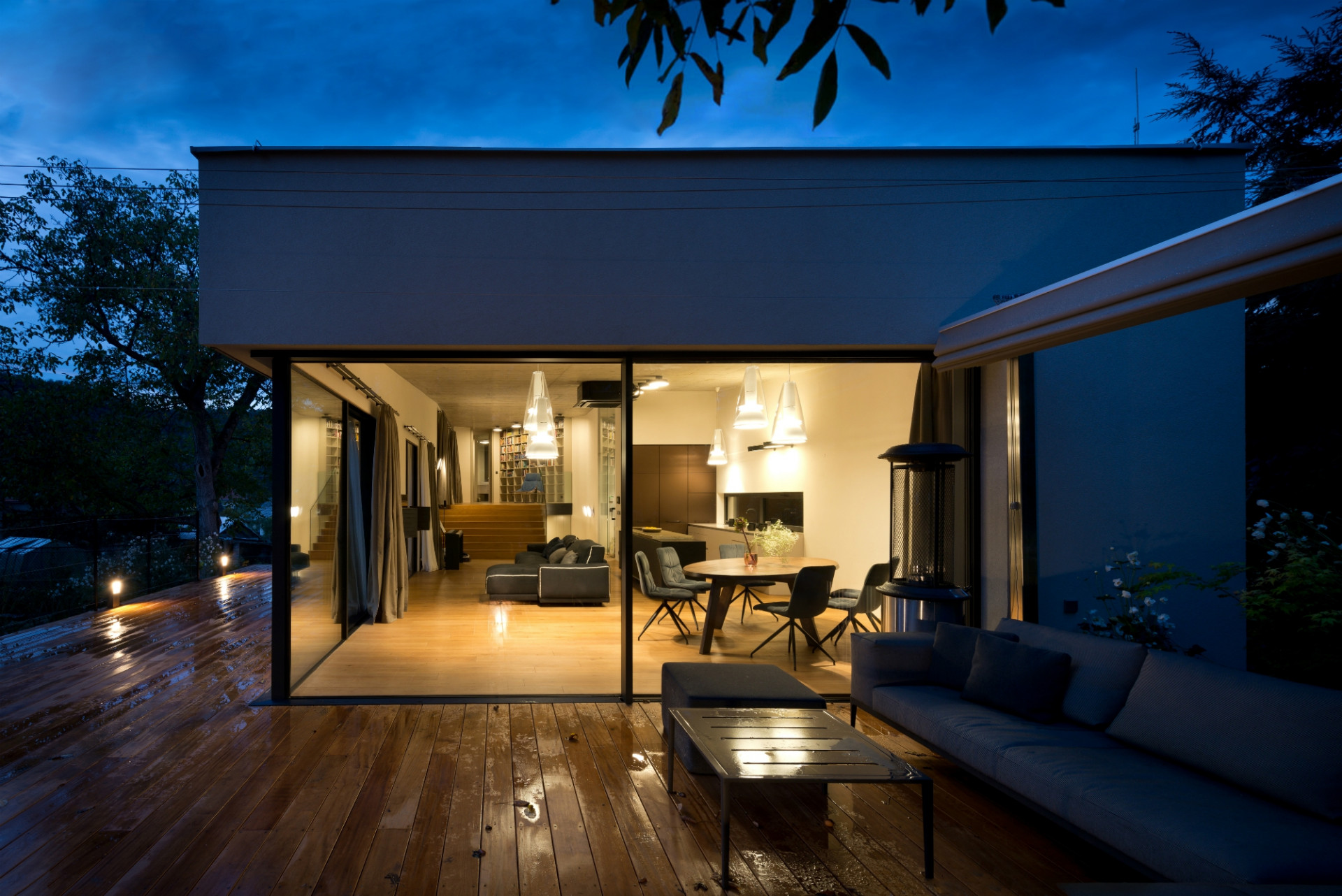 „Bylo to stavebně zajímavé, ale staticky náročné. Několikrát jsme to přepočítávali a měnili, nakonec jsme vytvořili obrovskou atiku se spoustou železa, aby nedošlo k průhybu stropního betonu ani o dva centimetry a okna nepraskla. Vznikl tím však krásný výhled, kdy se vám otevře zahrada a vy sedíte u jídelního stolu v obývacím pokoji a vlastně i v zahradě. Váš výhled přitom nic neruší, ani ten nejtenčí sloupek, takže vůbec nevnímáte, že sedíte uvnitř,“ líčí architektka, jaké pocity asi prožívají obyvatelé domu, když otevřou prosklený roh z posuvných křídel Schüco ASS 77 PD.HI - samozřejmě pohodlně ovládaných skrytým automatickým pohonem, ale i vysoce tepelně izolovaných díky trojsklu HI (High Insulation). Přirozené zastínění vytváří letitý ořech, takže žaluzie ani nebylo třeba.