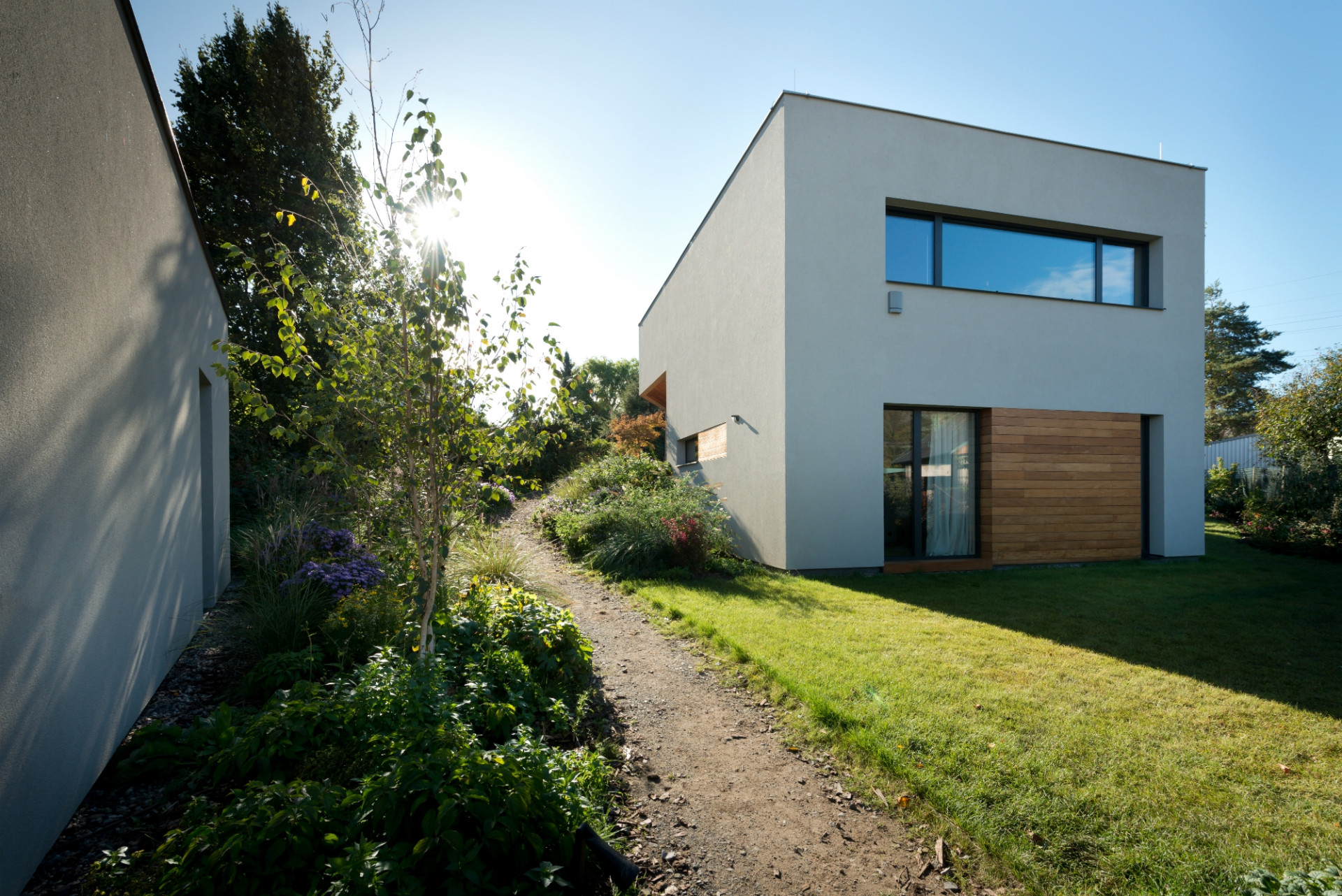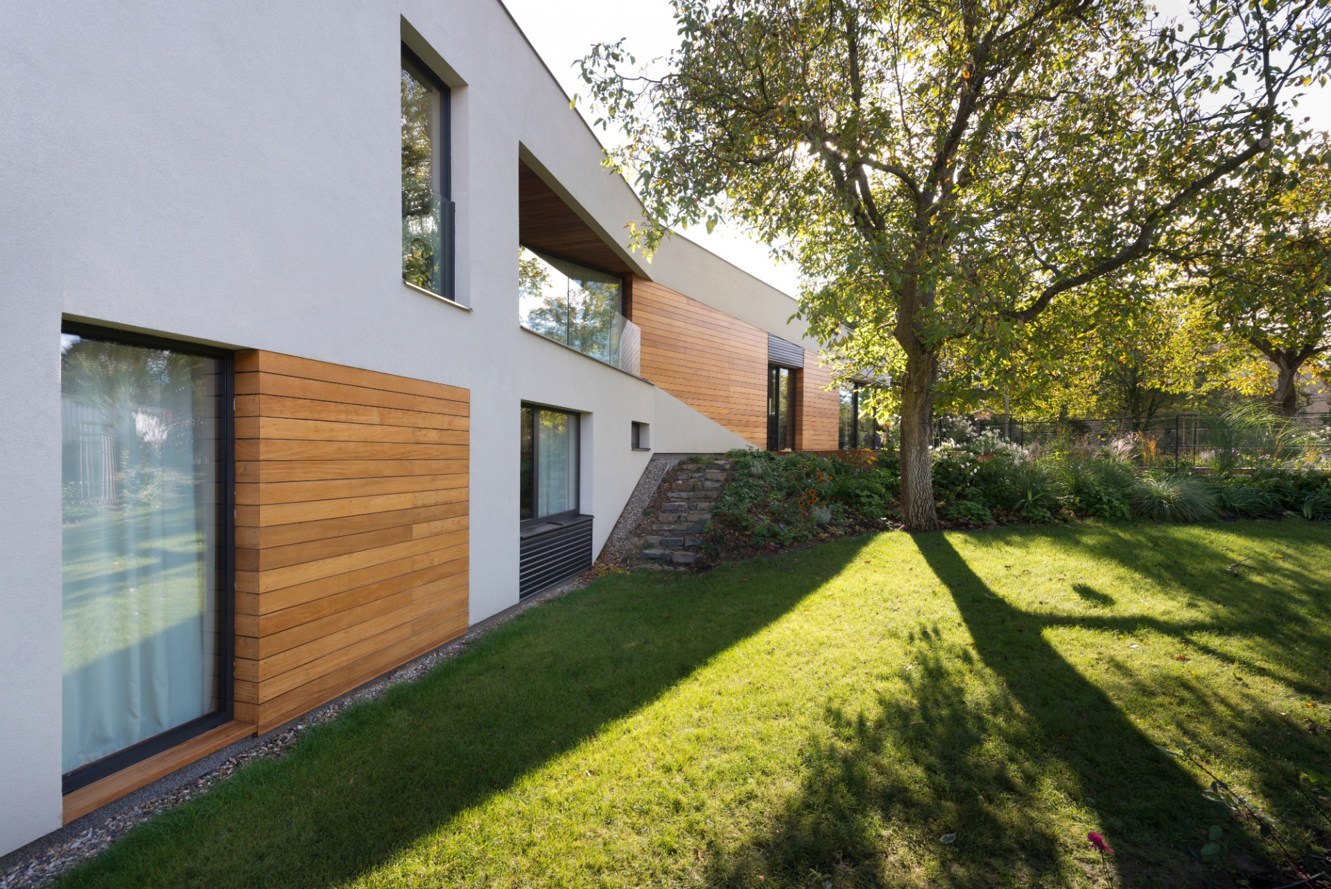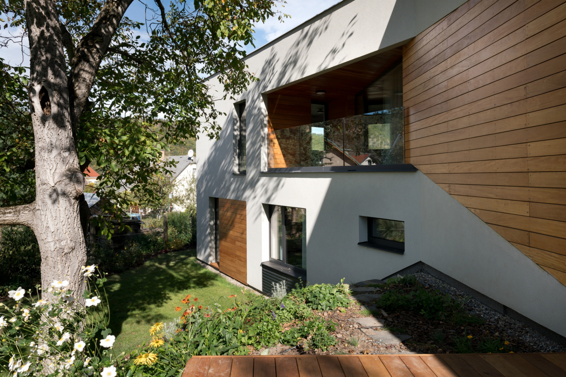 Dům je zalomený podle tvaru lichoběžníkového pozemku a jakoby sestupoval po svažité zahradě, skrytý mezi starými ořechy a třešněmi. Investoři totiž koupili pozemek v původní zástavbě, doslova uprostřed dalších zahrad, takže žádná strana jejich pozemku nevede podél komunikace. Přístup je po dlouhé úzké příjezdové cestě, odkrojené od sousedního pozemku. Dům tak z ulice není vůbec vidět, je schovaný pro dokonalé soukromí, utajeno pohledům zvenčí tak zůstává i jezírko s lekníny.