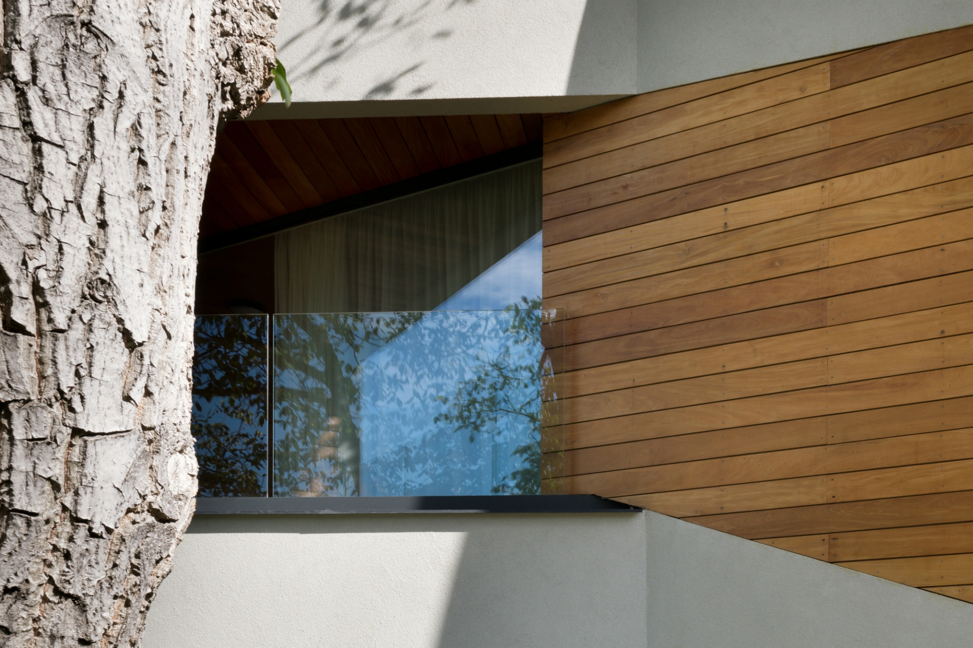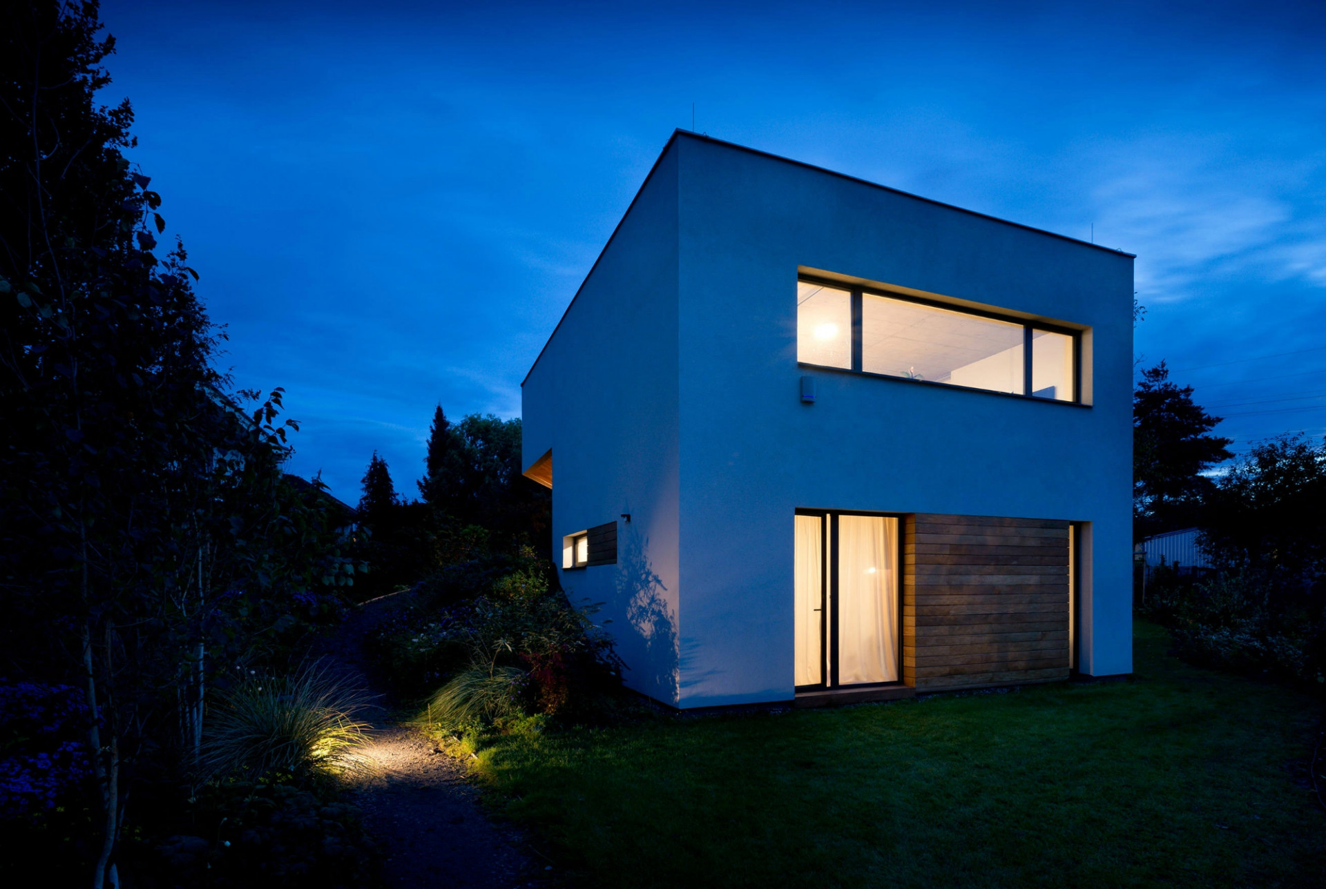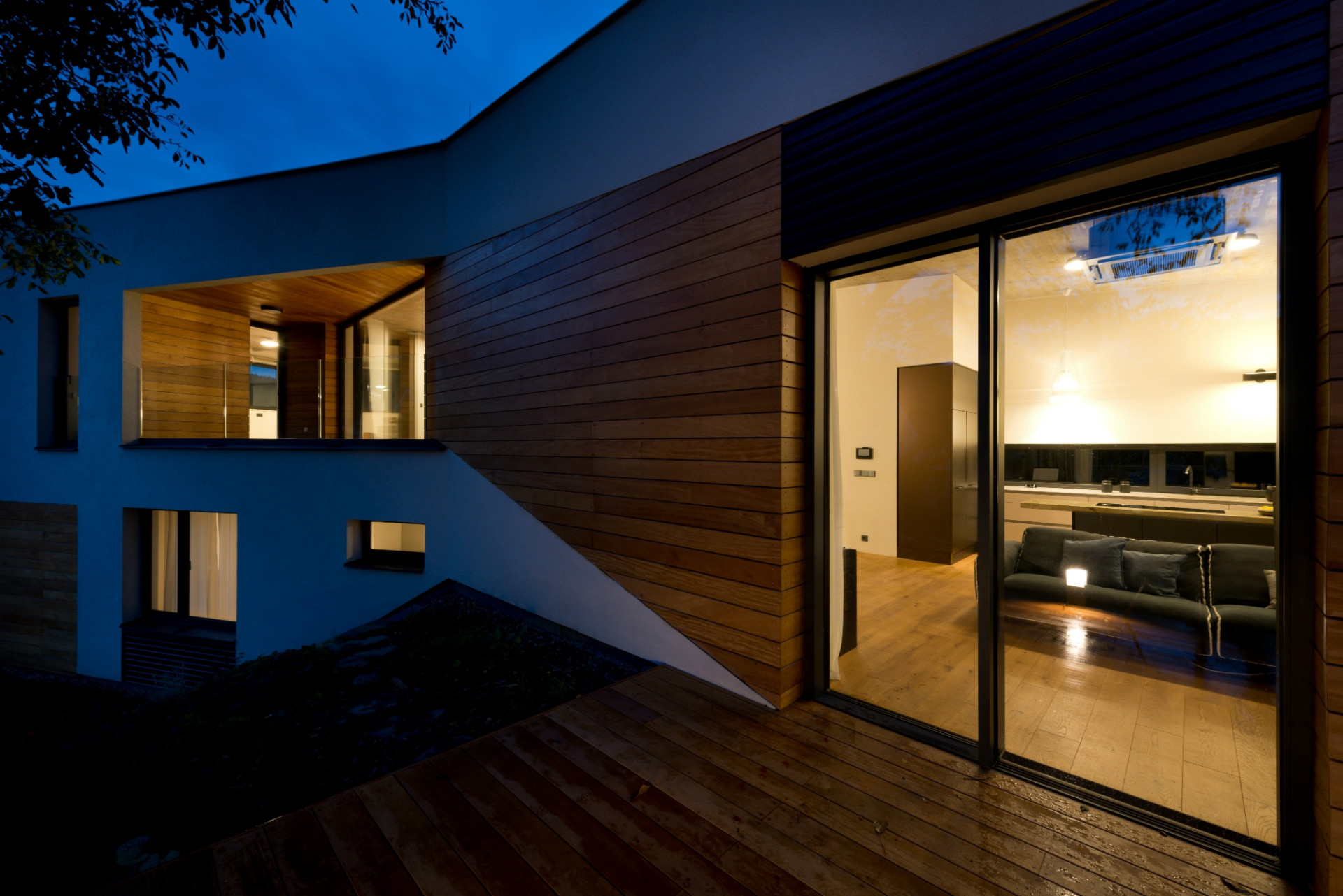 Dům je zalomený podle tvaru lichoběžníkového pozemku a jakoby sestupoval po svažité zahradě, skrytý mezi starými ořechy a třešněmi. Investoři totiž koupili pozemek v původní zástavbě, doslova uprostřed dalších zahrad, takže žádná strana jejich pozemku nevede podél komunikace. Přístup je po dlouhé úzké příjezdové cestě, odkrojené od sousedního pozemku. Dům tak z ulice není vůbec vidět, je schovaný pro dokonalé soukromí, utajeno pohledům zvenčí tak zůstává i jezírko s lekníny.
