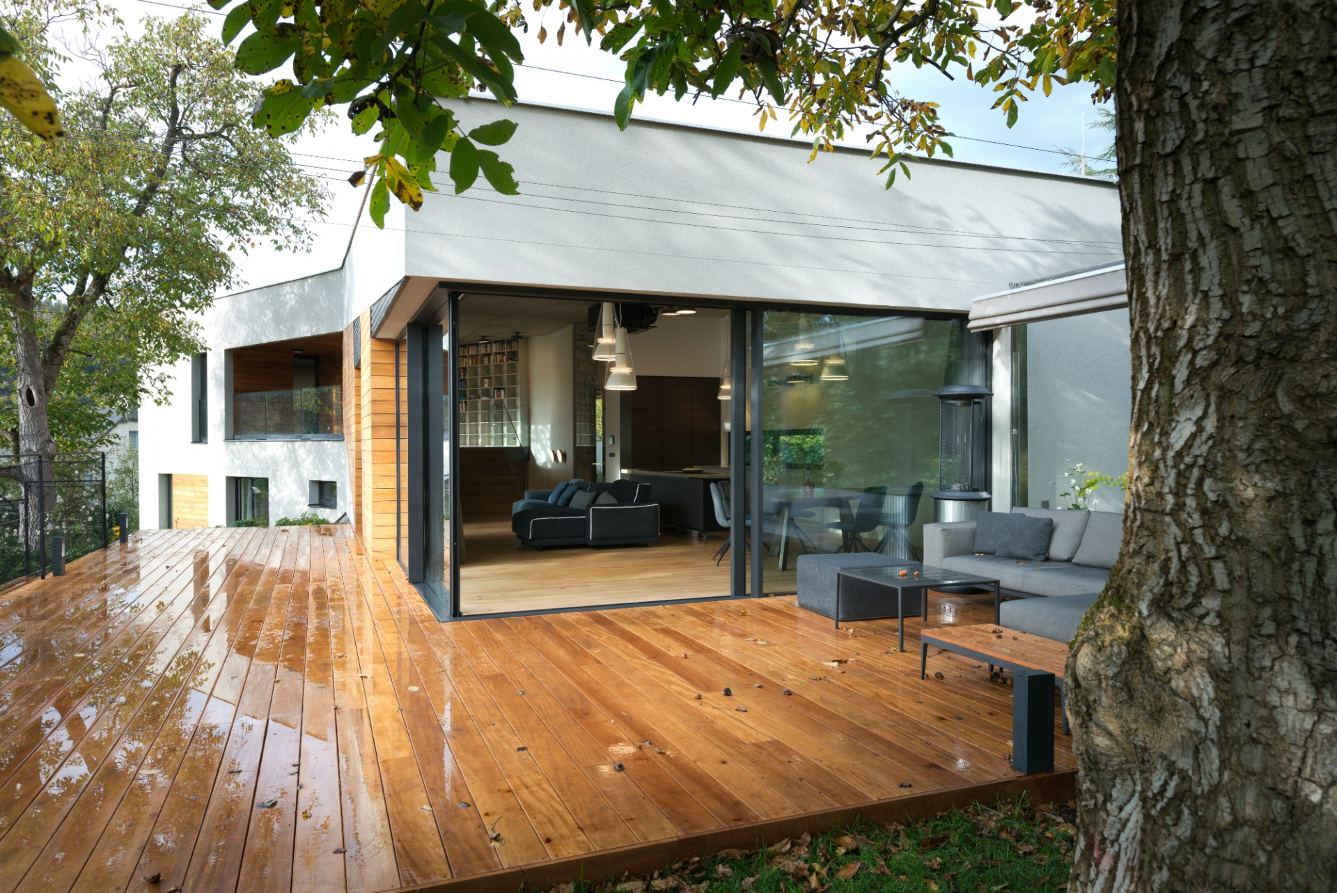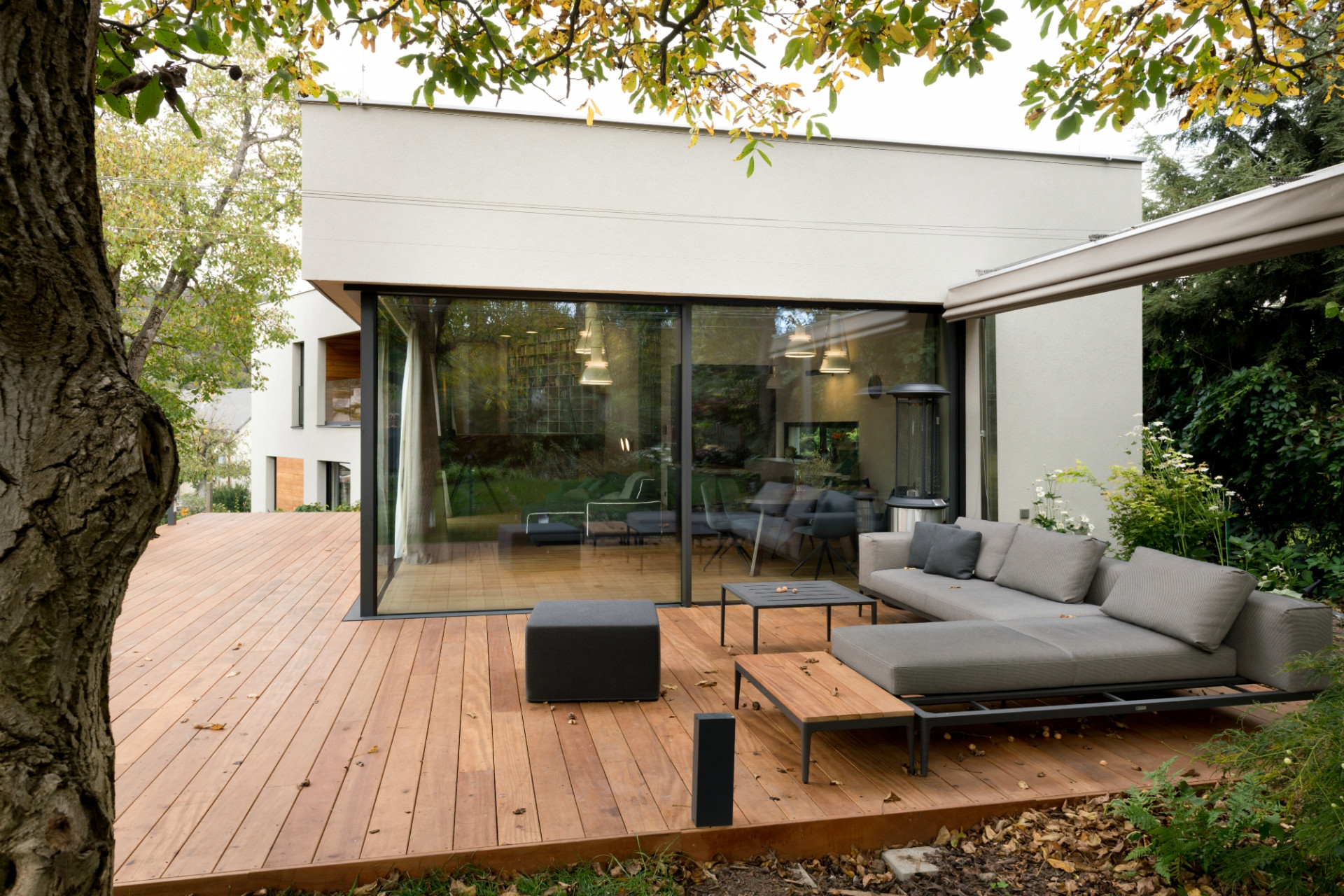 Schüco ASS 77 PD.HI umožňuje vytvořit 90° roh bez použití sloupků pro opravdu nerušené panoramatické výhledy. Kromě koruny ořechu se o stínění na terase stará i baldachýn.