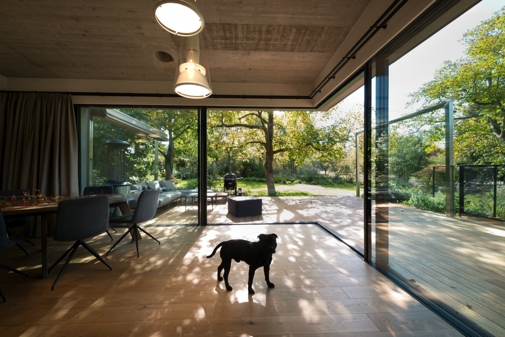 Otvíravý prosklený roh obývacího pokoje propojuje rodinný dům se zahradou