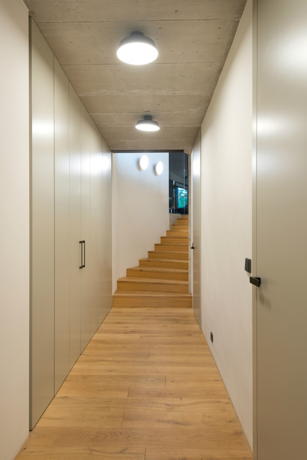 Od investora měla architektka stručné zadání, v podstatě jen počet pokojů a přání na velký obývací prostor. Zvolený interiérový minimalismus co do barev, materiálů i tvarů je laděn do odstínu matné bílé kávy (nábytek a bezfalcové dveře na výšku místností). Industriální pohledové betony na stropech jsou vyvažovány teplejšími odstíny dubové podlahy. Architektka přiznává, že syrových šedých betonů se investor zprvu bál. „Já vždycky říkám, pojďme to zkusit, a když se Vám to nebude líbit, tak to přetřeme. A tento přístup funguje, ještě se žádný betonový strop nepřetíral.“ O spokojenosti investora s návrhy architektky svědčí i to, že už zvažuje výstavbu dalšího domu...