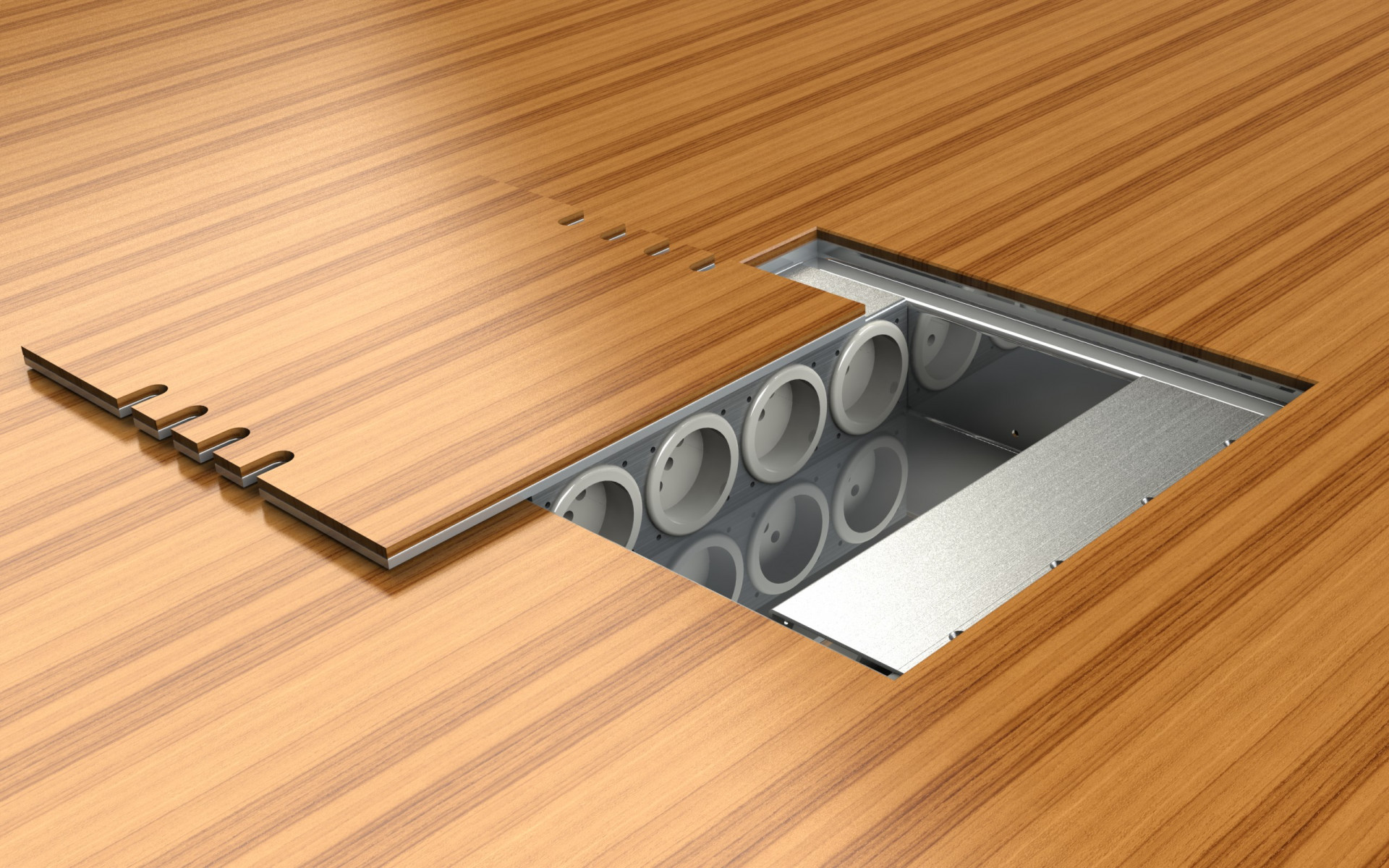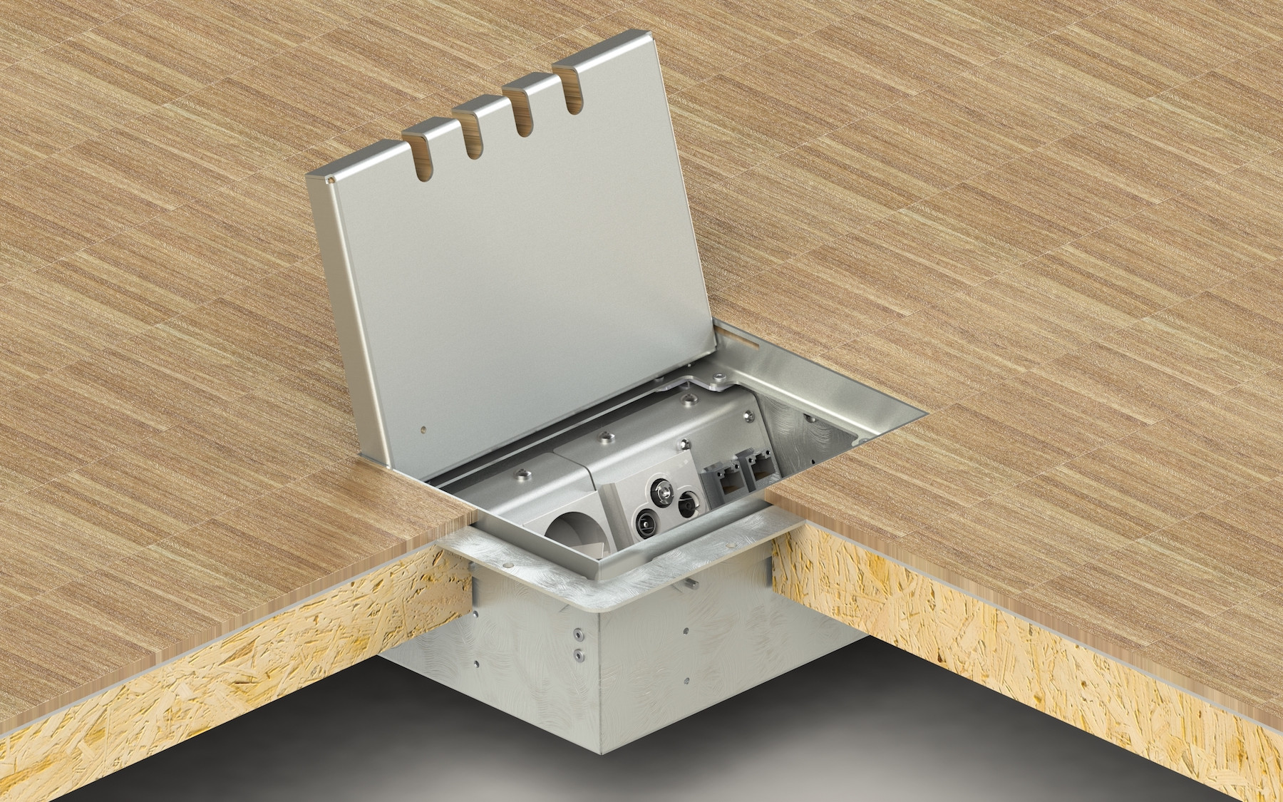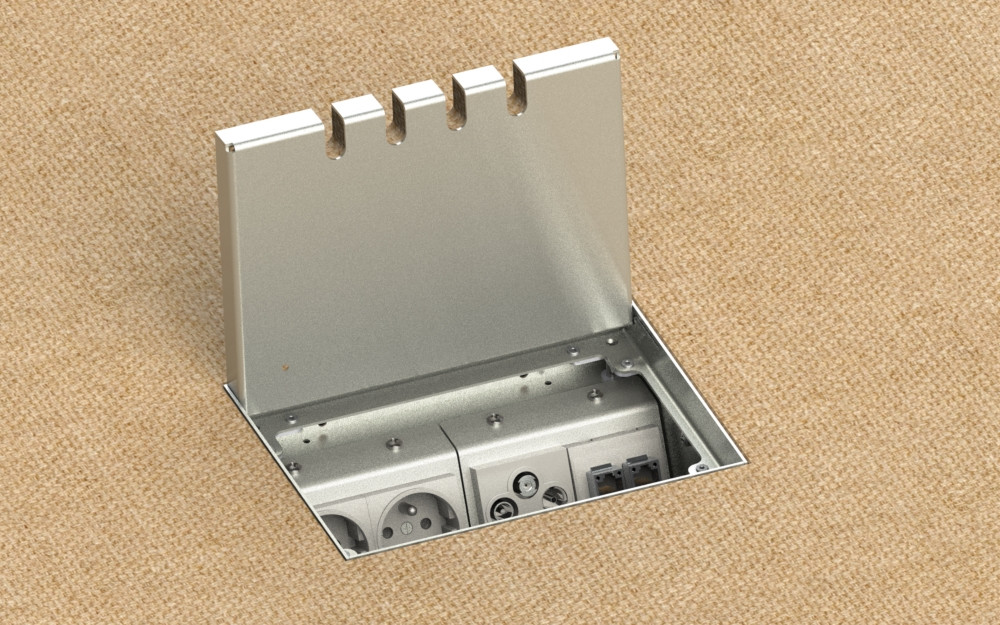 A to není všechno. Díky konstrukci podlahových boxů a předem připraveným otvorům ve víku budete mít zásuvky i zástrčky ukryté i v okamžiku, kdy je používáte. Pokud si dobře rozvrhnete umístění podlahových zásuvek, můžete navíc klidně dát sbohem všem prodlužkám.