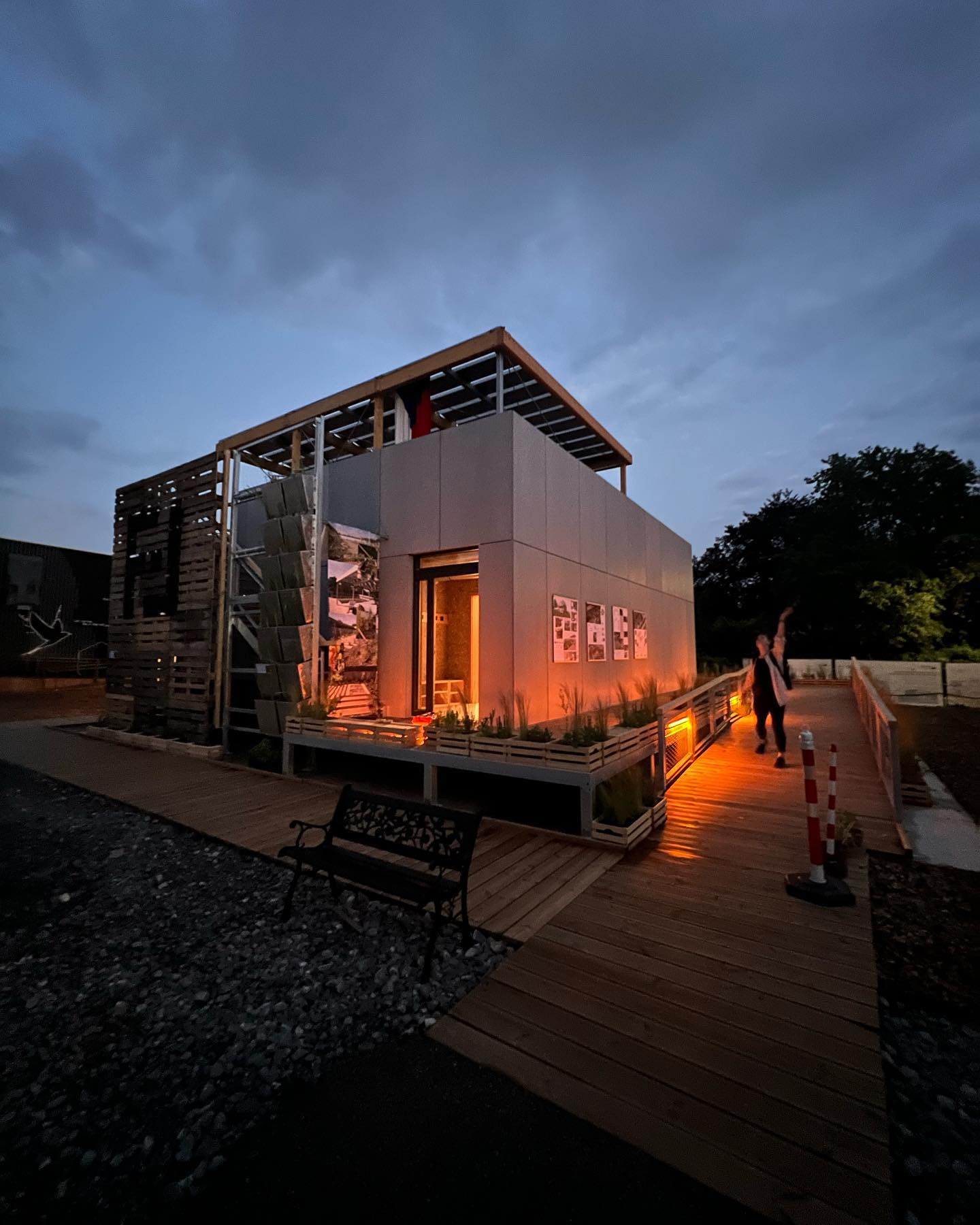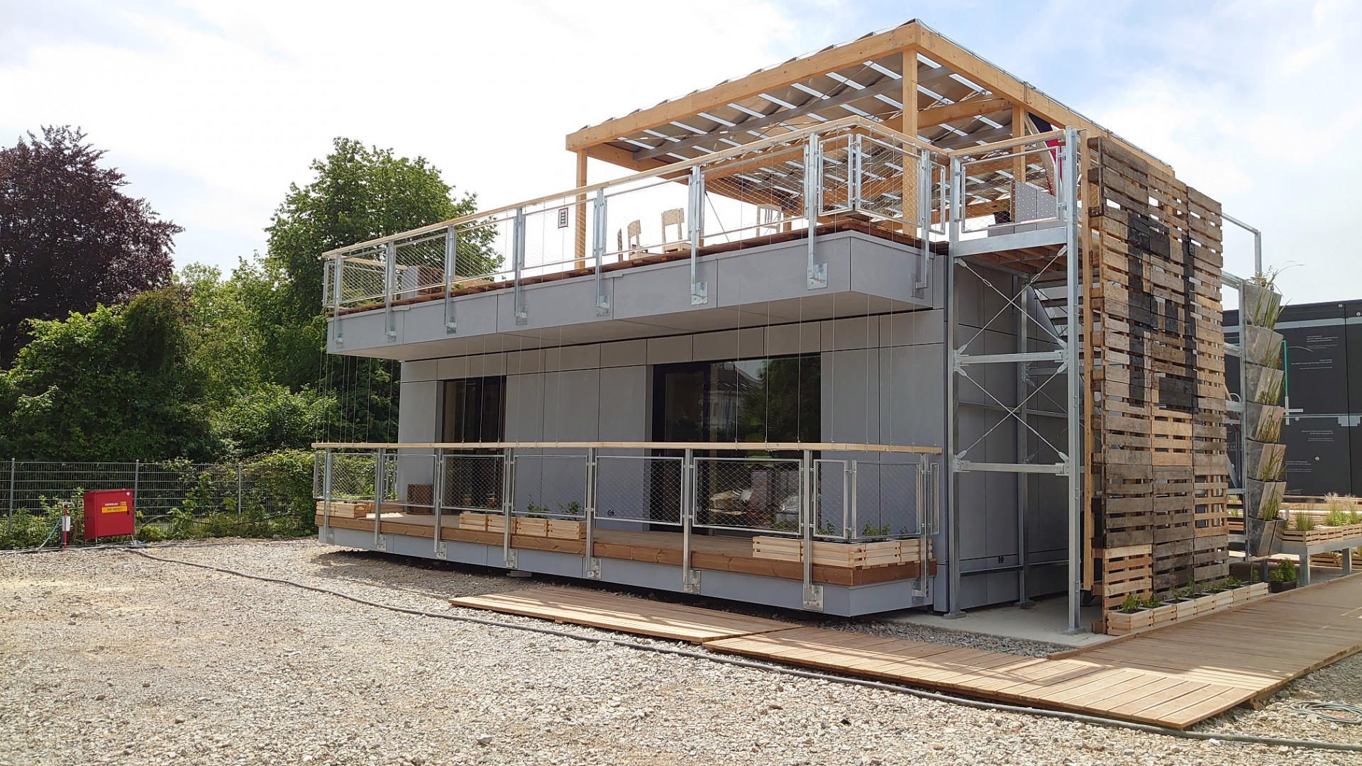 Jelikož je celý objekt lehce vyvýšen, vede k hlavnímu vstupu rampa vinoucí se kolem dokola domu. Končí na terase, která je seshora krytá balkonem, který rozšiřuje plochu střešní terasy. Studenti se rozhodli i pro úpravu okolního prostředí a květináče se zelení chytře zakrývají neatraktivní mezeru mezi zemí a domem nebo zdobí schodišťovou konstrukci spolu s paletovými deskami.