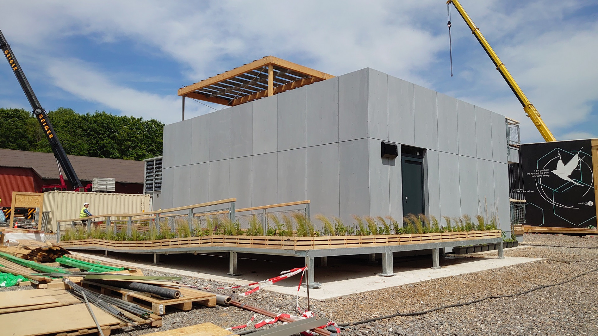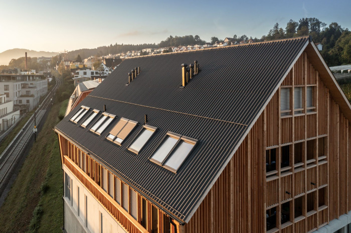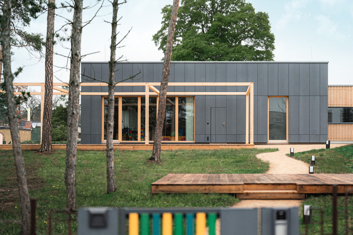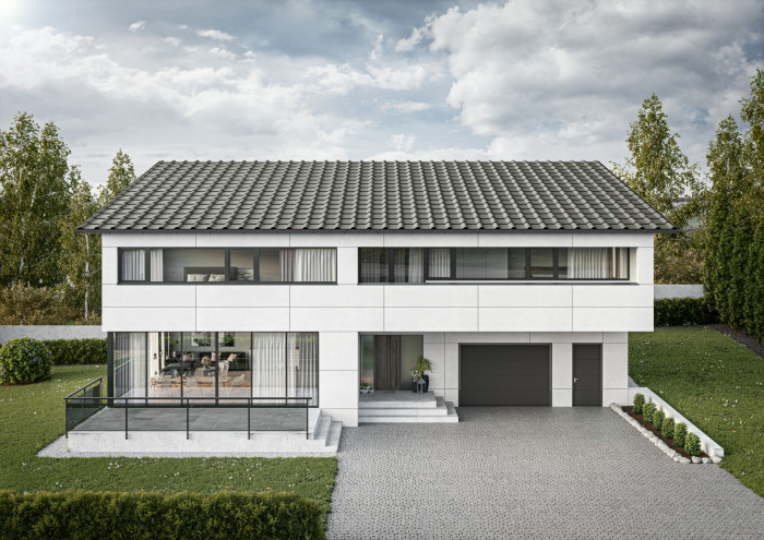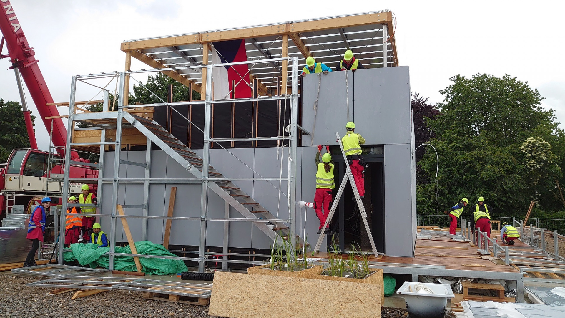 Dům českého týmu FIRSTLIFE je jednopodlažní objekt s pobytovou střechou, kam vedou venkovní schody. Stín poskytuje dřevěná pergola. Přírodní dřevo doplňují šedé kovové prvky zábradlí nebo světle šedé fasádní desky od firmy CEMBRIT, konkrétně Patina Original v odstínu P020. Osmimilimetrové nehořlavé a bezúdržbové desky mají probarvené jádro a broušený povrch, který zaručuje přirozenou proměnu v průběhu času. Výhodou těchto desek představuje také prakticky nulová potřeba údržby.