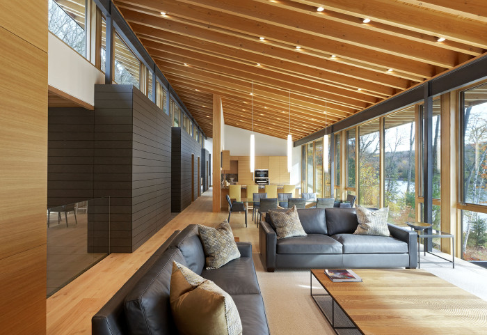 Hlavním prvkem interiéru je opět přírodní dřevo, které doprovází surové materiály. Stropní lištové osvětlení je nenápadné, ale přesto zútulňuje atmosféru vnitřku. Světlé plochy nabízejí možnost podílet se na grafické stránce, k čemuž vybízejí pastelky a fixy, které jsou veřejnosti volně k dispozici.