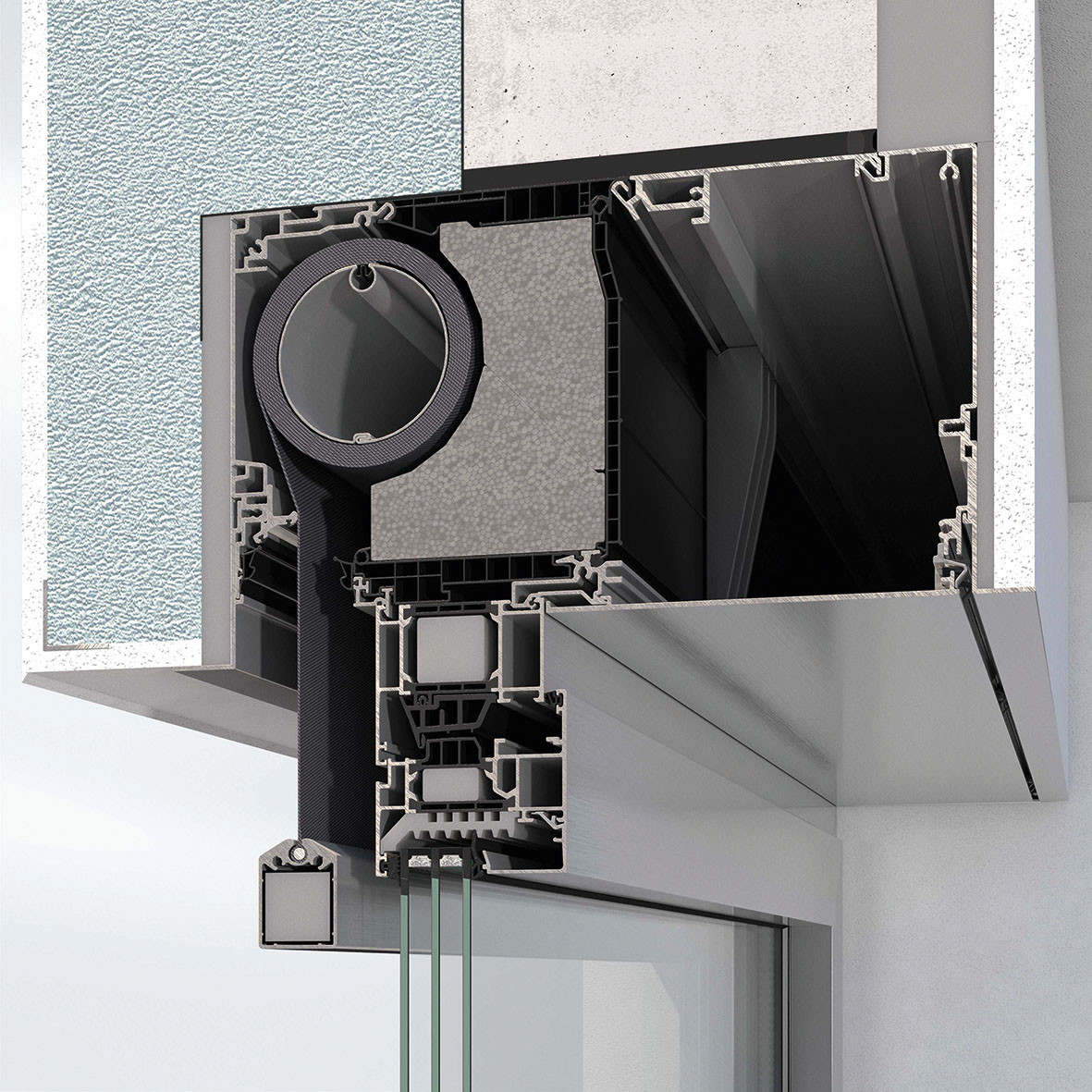 Společnost Schüco také nabízí další sluneční clony, jako je například vnější hliníkový roletový systém Schüco CSB (Concealed Shaped Blind) a dynamicky tónovaná skla SageGlass (ve spolupráci se společností Saint-Gobain).