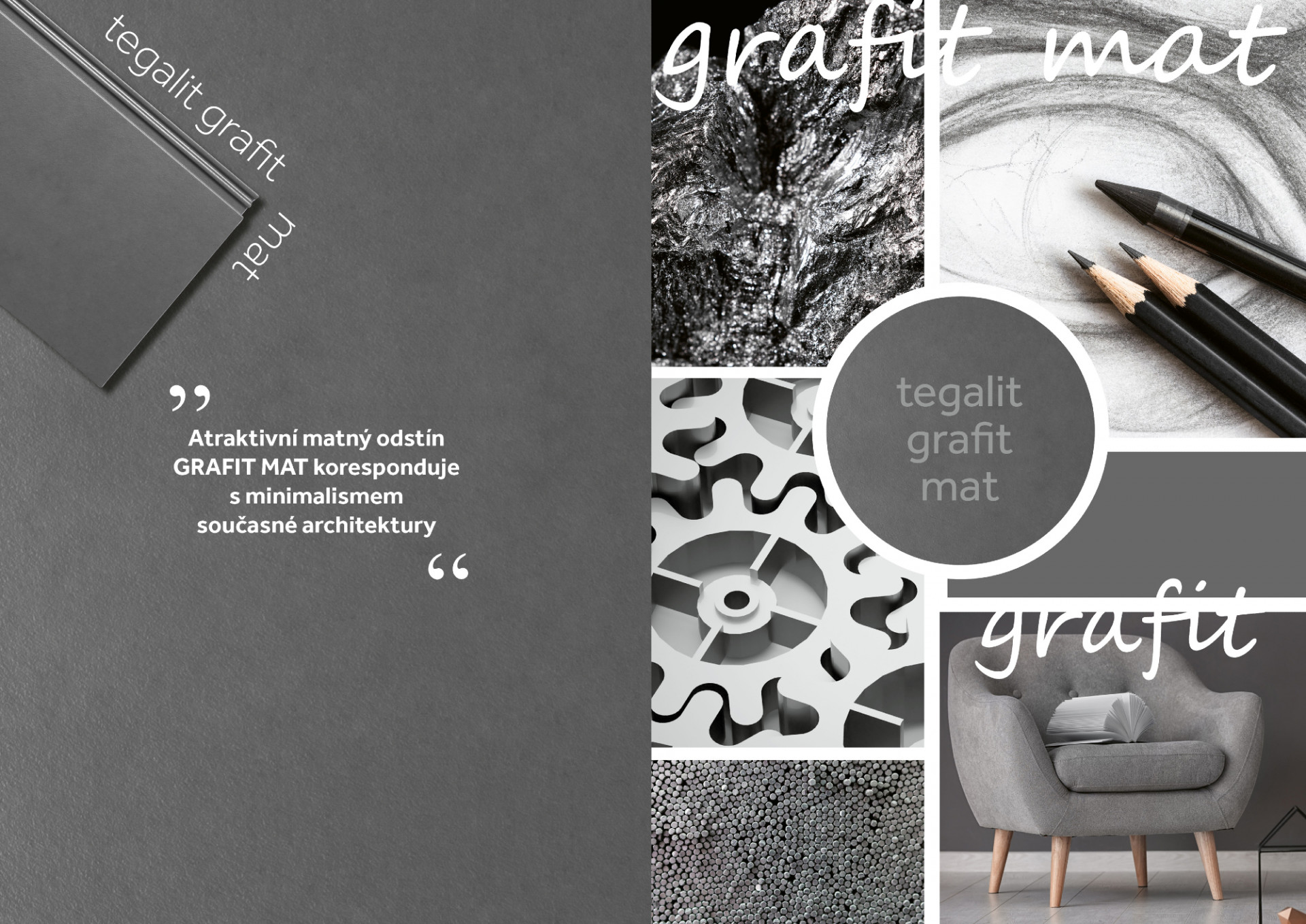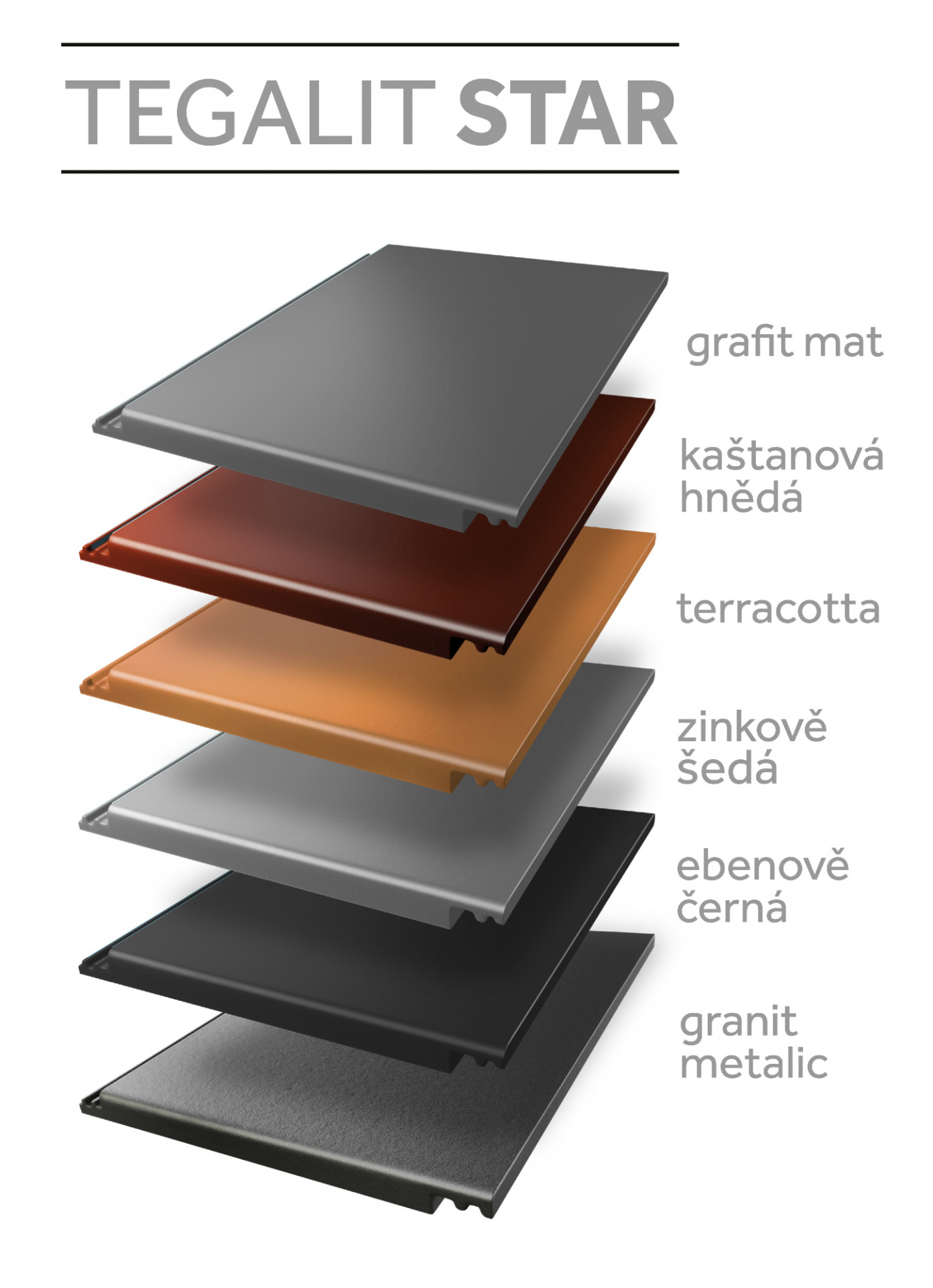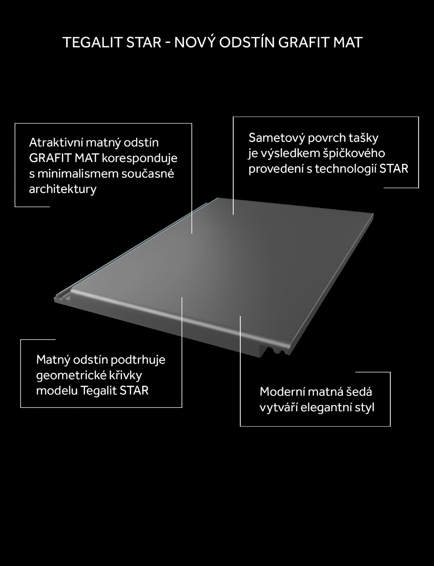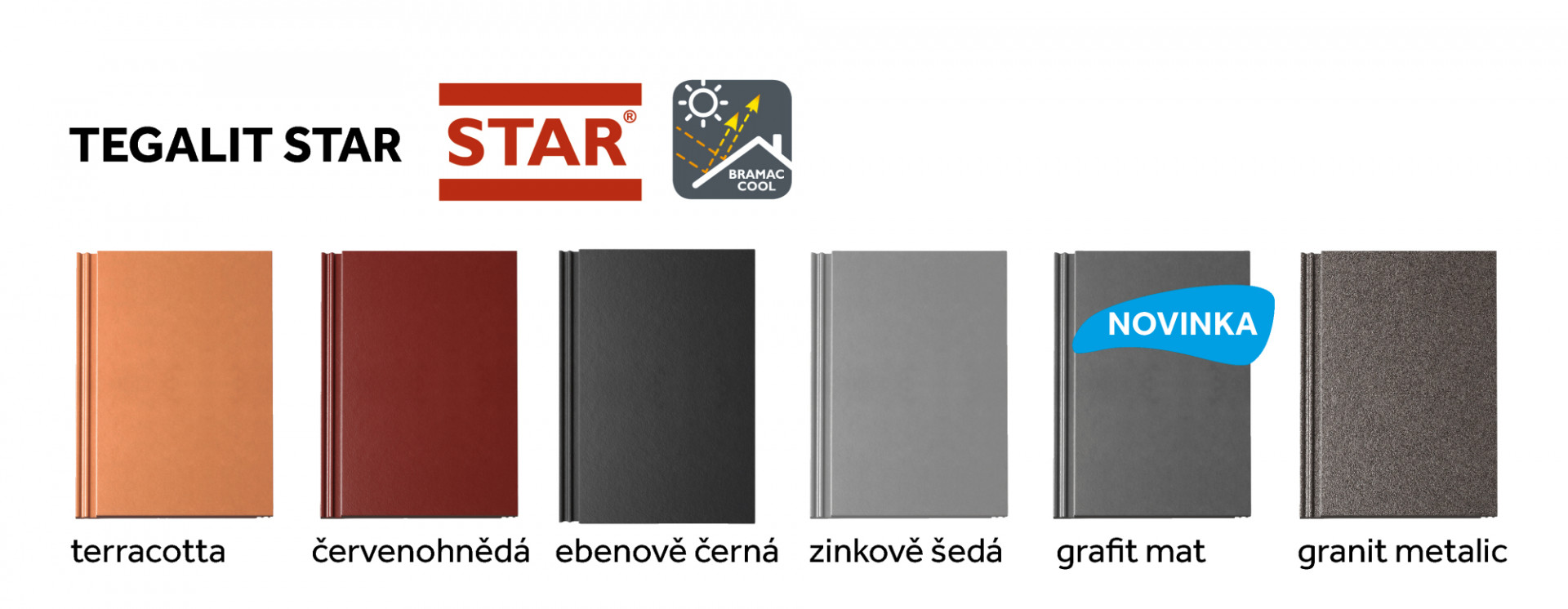 Betonová taška Tegalit STAR se v posledních letech u zákazníků těší čím dál větší oblibě, a to díky rovnému profilu a čistým liniím, které korespondují s minimalismem současné architektury. Aktuálně je nabízena v šesti barevných odstínech, včetně metalické barvy granit metalic nebo nevšedního odstínu zinkově šedé. Novinka grafit mat podtrhuje geometrické křivky Tegalitu, zároveň umocňuje sametový povrch tašky, který je výsledkem špičkového provedení s technologií STAR.