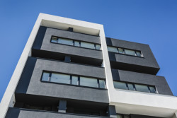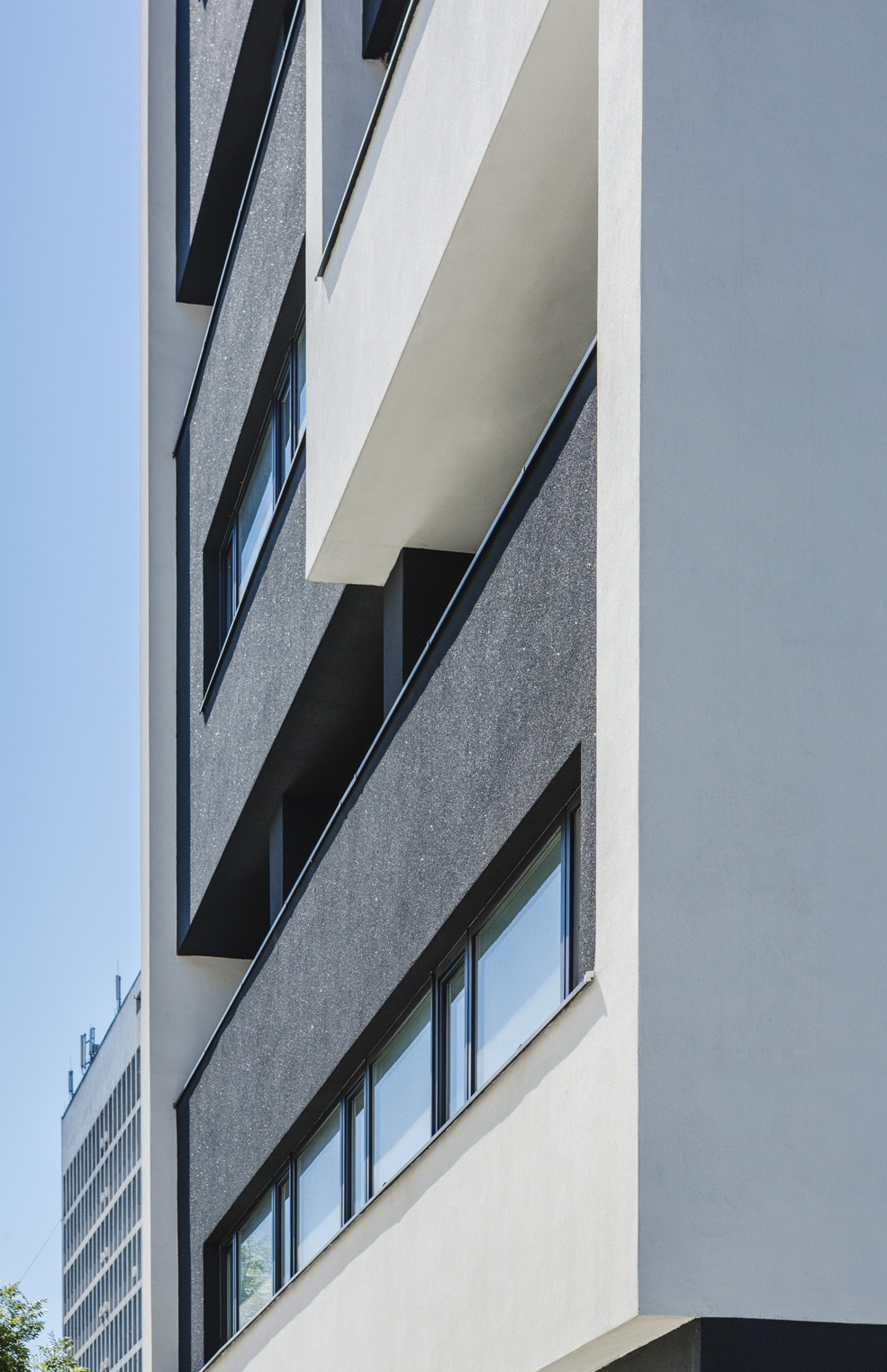 Do zeleného prostředí západobratislavské části Karlova Ves navrhlo studio cakov + partners šestipodlažní bytový dům. Objekt představuje kompozici bílých a tmavě šedých hmot, které se vzájemně prolínají a dohromady vytvářejí hravý celek. Stěny budovy jsou opatřeny granulátovou omítkou systému StoSignature s průhlednými úlomky skla dodávajícími fasádám netradiční lesk.