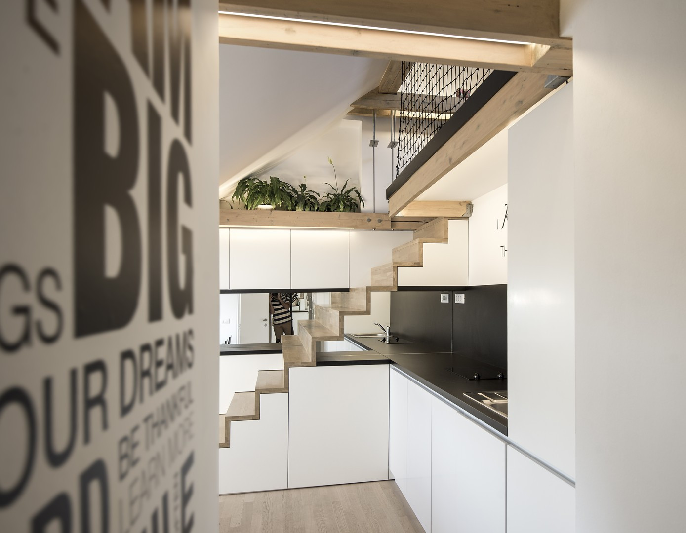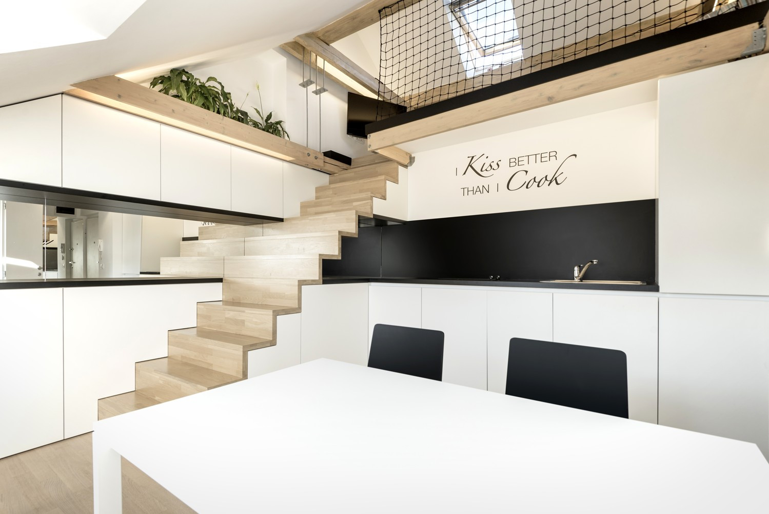 Obě patra vzájemně propojuje jednoduché, dřevěné schodiště, které se opticky zakusuje do kuchyňské linky, přičemž se odráží v pásu zrcadlového obkladu aplikovaného nad pracovní plochu kuchyně. Nutno však podotknout, že v případě lublaňského bytu schodiště nepředstavuje pouze komunikační prvek, ale také jakési rozšíření celkové pobytové plochy prostoru, což ovlivnilo i jeho design a otevřenost vůči zbytku dispozice, jež přímo vybízí k posezení a odpočinku.