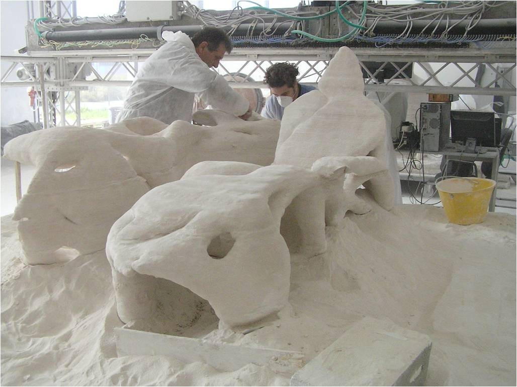 Technologie, která je obdobou technologie laserového slinování prášku, spočívá ve sprejování vrstev plniva (jemnozrnný písek) a tekutého pojiva (cement, příp. polymerní pryskyřice) v prostorově ohraničené tiskové komoře. Byla vyvinuta německou společností Voxeljet (obr. 18) jako stejnojmenná technologie původně pro tisk pískových slévárenských forem a italským vynálezcem Enricem Dinnim jako technologie D‑Shape (obr. 19 a 20). Proces tisku začíná u obou variant nanesením vrstvičky písku v řádu setin až jednotek mm v ploše ohraničené tiskovou komorou. Na každou vrstvu plniva je následně ve druhém kroku nasprejováno tryskou, příp. soustavou až tisíců trysek o průměru desetin milimetrů pojivo v místě polohy budoucí konstrukce (obr. 21). Po nasprejování modelem určených míst v rámci předmětné vrstvy je proces opakován až do doby nasprejování poslední vrstvy. Pojivem nezasažené plnivo je během tuhnutí podporou nadlehlým vrstvám, tato metoda tedy umožňuje téměř neomezenou volnost tvarů. Po vytvrdnutí pojiva je nevyužité plnivo v poslední vrstvě mechanicky odstraněno, nejčastěji odsáto pryč, takže v tiskovém prostoru zůstává pouze finální prvek (obr. 22).