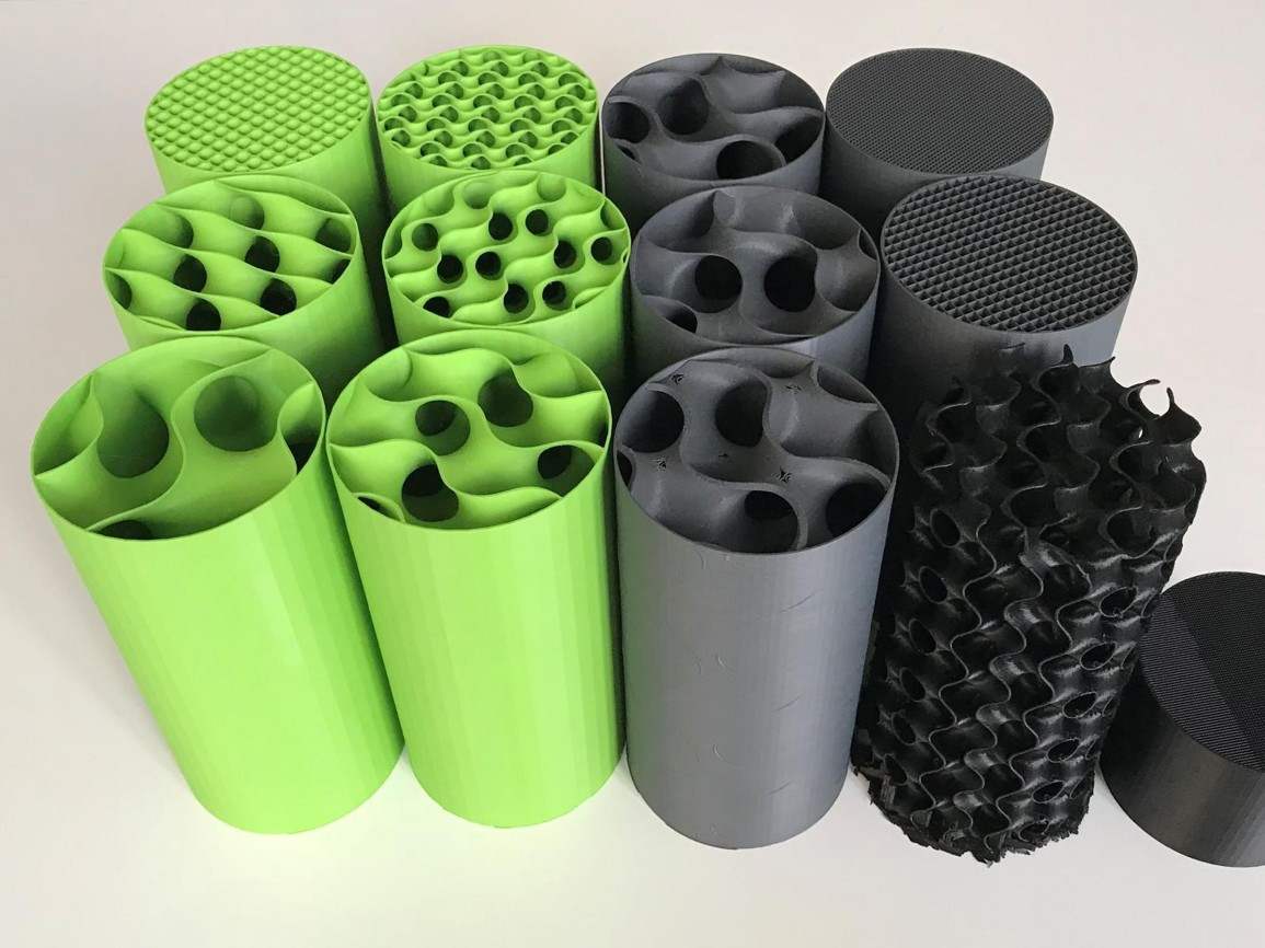 V 3D tiskárnách vyvíjených pro oblast stavebnictví je využíváno široké spektrum materiálů, jejichž použití závisí na tiskové technologii. Existující projekty využívají geopolymery, hlínu, kov, plasty, stavební recyklát a kompozitní materiály často s příměsí umělých nebo skelných vláken. Velmi cenným tuzemským přínosem do světového výzkumu je projekt pod vedením Dr. techn. Ing. Jana Podroužka z Fakulty stavební VUT v Brně využívající geometrii minimálních ploch pro výplňovou strukturu sloupů a umožňující dosáhnout při tisku z kukuřičného plastu velmi slibných statických vlastností (obr. 7).