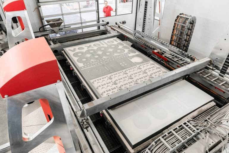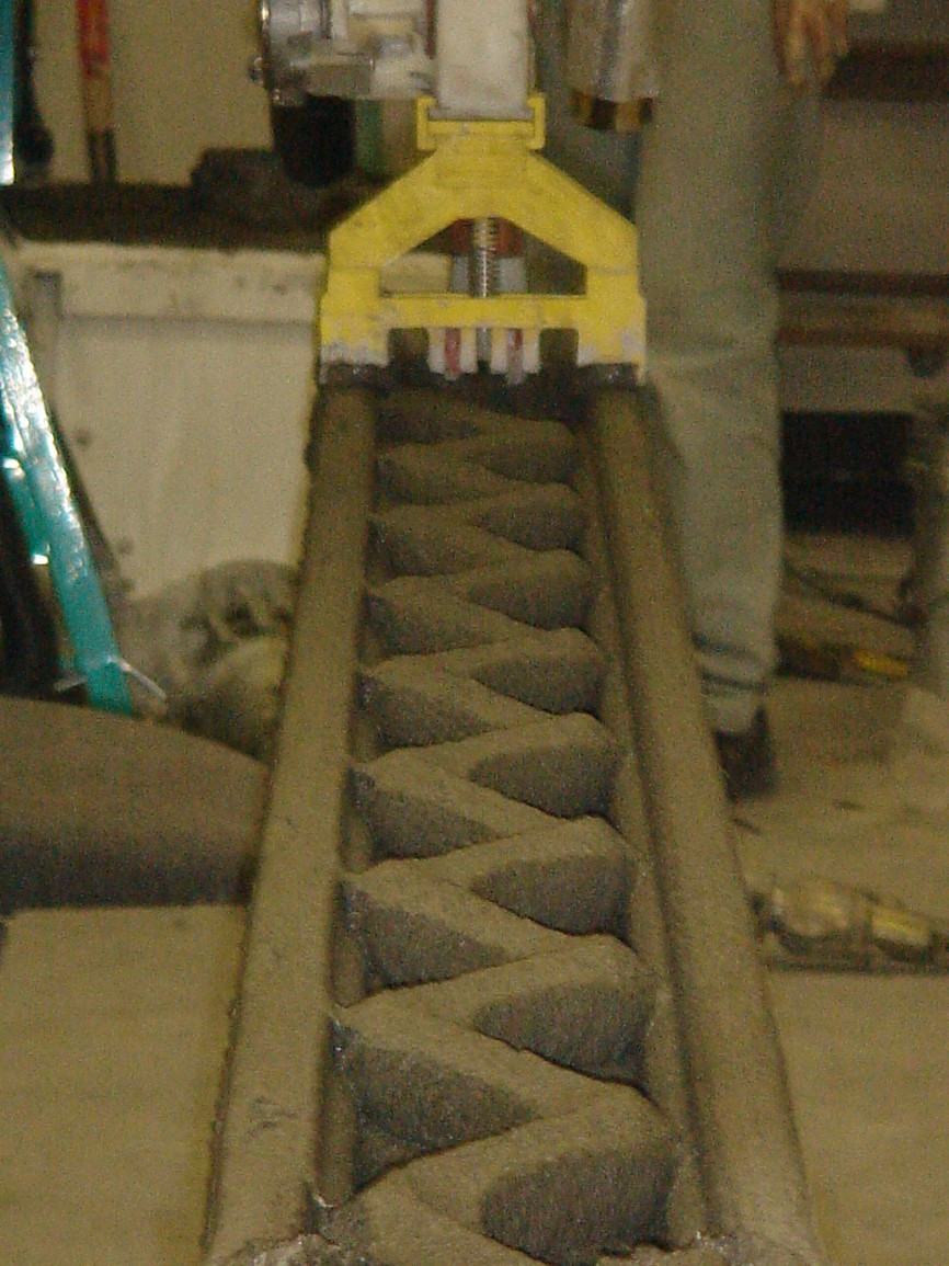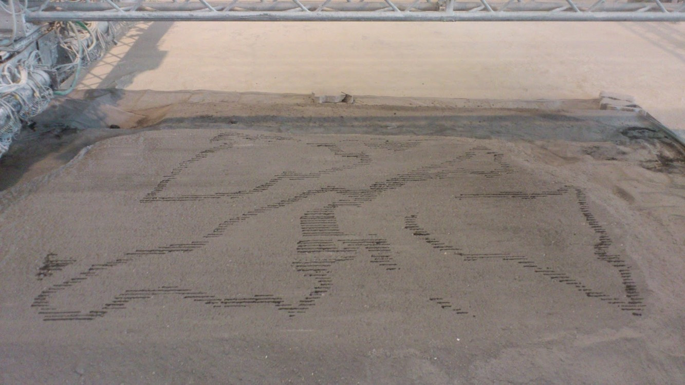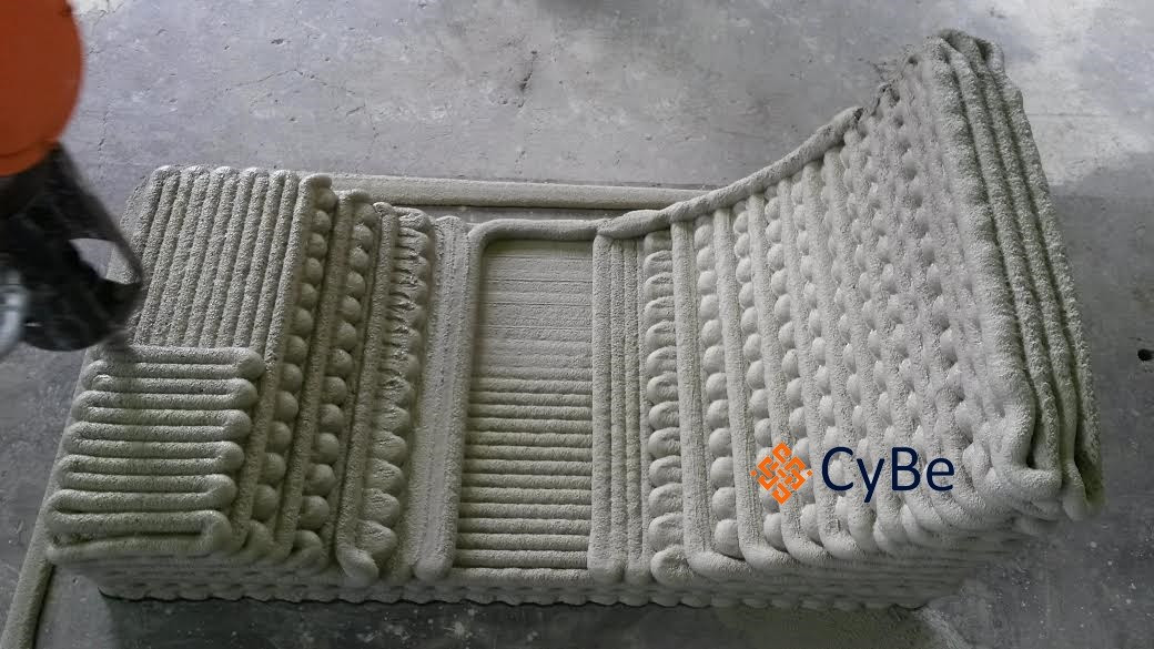 Zajímavým hybridem, snažícím se spojit výhody dvou výše popsaných technologií, je řešení vyvinuté francouzskou společností XTreeE (obr. 26 a 27). Tato technologie spočívá ve vytlačování cementové malty do tiskové komory, která je během tisku ručně vyplňována pískem do úrovně vytištěné vrstvy. Písek funguje podobně jako u 3D tisku spojováním prášku jako podpora vytištěným vrstvám a po dokončení tisku je odstraněn.