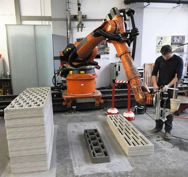 Pohyb tiskové hlavy je řešen formou robotické ruky na bázi komerčního průmyslového robota (obr. 30) s obvykle šesti stupni volnosti (osami otáčení). Tiskový prostor je dán zakřivenou 3D plochou o rozměrech daných délkou článků ruky a úhlem pootočení v kloubech. Oblast využití lze spatřovat v tisku svislých nosných konstrukcí in situ, prefabrikátů, mobiliáře, kompletačních konstrukcí a v dokončovacích pracích. Výhodné je využití u staveb, kde je tiskový prostor omezen, neboť tento typ tiskáren umožňuje tisk jen z jedné strany (např. tisk jednostranného ztraceného bednění v tunelech, u pažicích stěn atd).