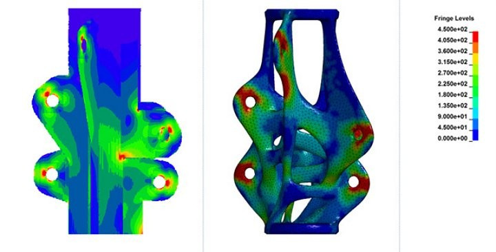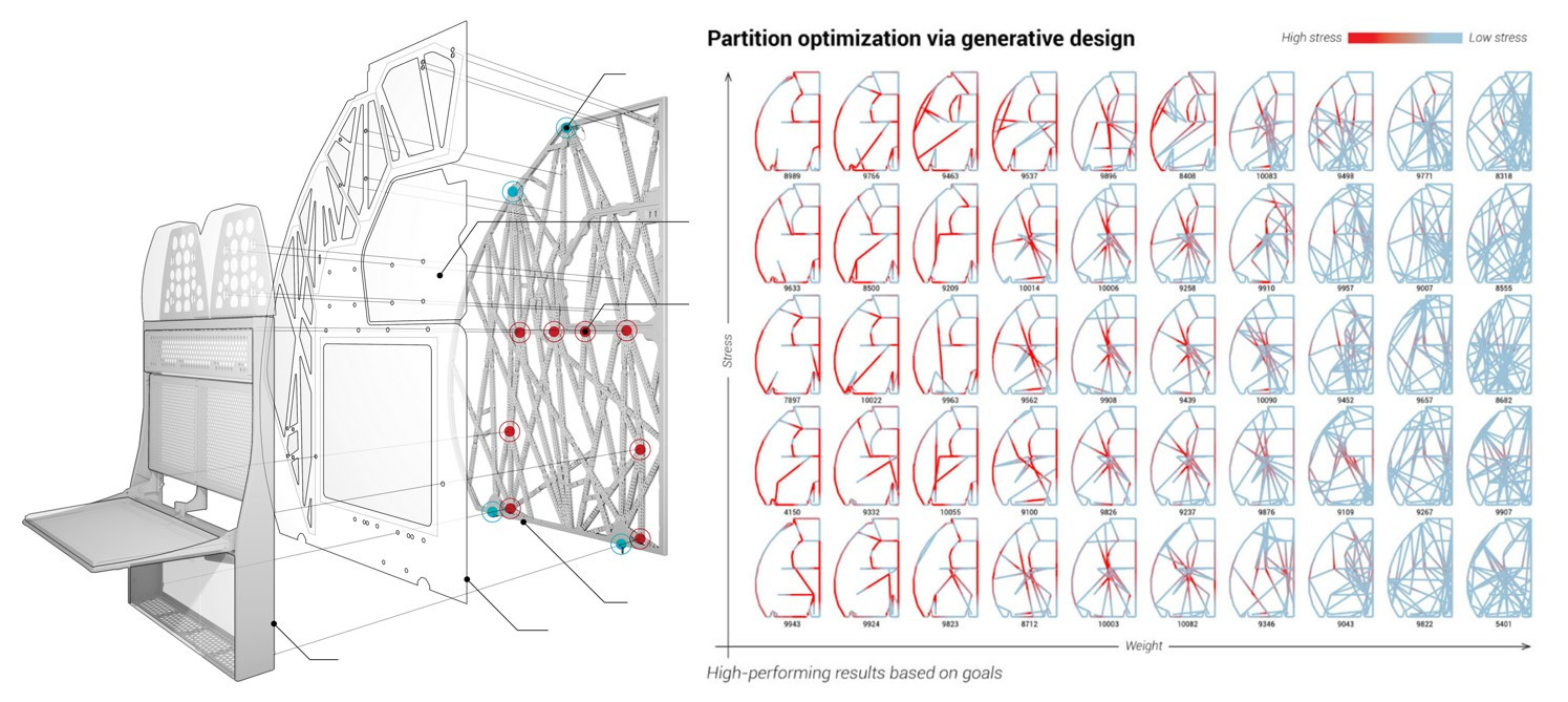 S rozvojem počítačů se vedle BIM začínají objevovat i další novátorské přístupy, které zásadním způsobem mění přístup k návrhu spotřebních výrobků, strojů i staveb. Velmi perspektivními se jeví tzv. parametrické a generativní navrhování. Parametrické navrhování spočívá v tvorbě geometrie počítačem prostřednictvím projektantem sestaveného skriptu s volitelnými parametry, který v sobě uchovává celou historii návrhu a umožňuje výslednou geometrii změnou parametrů kdykoliv modifikovat.6 Ztělesněním parametrického navrhování je stále populárnější architektonický styl „parametrismus“, který může být chápán jako reakce na současnou, na počítačích založenou civilizaci.7 Při generativním navrhování je výsledná forma generována algoritmem na základě okrajových podmínek, fyzikálních parametrů a předem zadaných cílů návrháře jako je cena, hmotnost, konstrukční materiál atd.8 Jedním z cílů tohoto přístupu, napodobujícího přírodní principy evoluce živých organismů, může být tzv. topologická optimalizace, tj. optimalizace vnějšího tvaru i vnitřní struktury průřezu tak, aby byl materiál podobně jako např. v kostech obratlovců maximálně využit. Tvary, které tato technologie generuje, připomínají přírodní organicky tvarované struktury s průřezem vylehčeným miniaturními uzavřenými komůrkami. Zásadním rozdílem oproti dnešnímu způsobu navrhování je skutečnost, že namísto jedné varianty návrhu generuje tato technologie ve výsledku soubor až tisíců funkčních variant. Úlohou projektanta je v tomto případě vhodně sestavit algoritmus, cíle a okrajové podmínky a poté vybrat variantu, která nejlépe vyhovuje cílovým požadavkům. Výhody generativního navrhování lze dobře ilustrovat na společném projektu firem Autodesk a Airbus,9 který měl za cíl vylehčit pro dopravní letadlo A320 palubní přepážku o hmotnosti 65 kg, vyráběnou běžnými strojírenskými technologiemi. V prostředí aplikace pro generativní navrhování Autodesk Dreamcatcher využívající umělou inteligenci a strojové učení byla z výsledného souboru variant s různými statickými charakteristikami a jim odpovídajícími hmotnostmi (obr. 2) vybrána pro výrobu varianta přepážky o hmotnosti 30 kg. Generativní návrh přinesl snížení hmotnosti přepážky o 55 % při současném zlepšení jejích statických vlastností, což ve výsledku znamená masivní úsporu pohonných hmot při provozu dopravního letadla. Protože běžné strojírenské výrobní technologie neumožňují optimalizovaný tvar přepážky vyrobit, bylo využito technologie 3D tisku slinováním (laserovým spékáním) kovového prášku s využitím slitiny, vyvinuté speciálně pro potřeby 3D tisku.