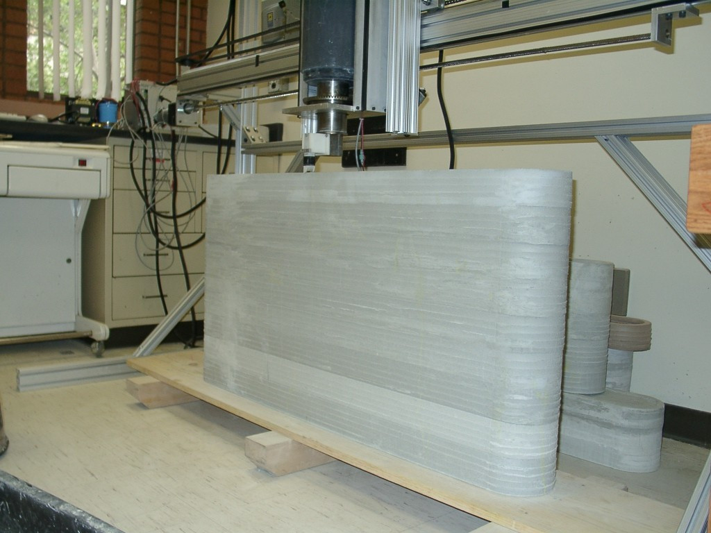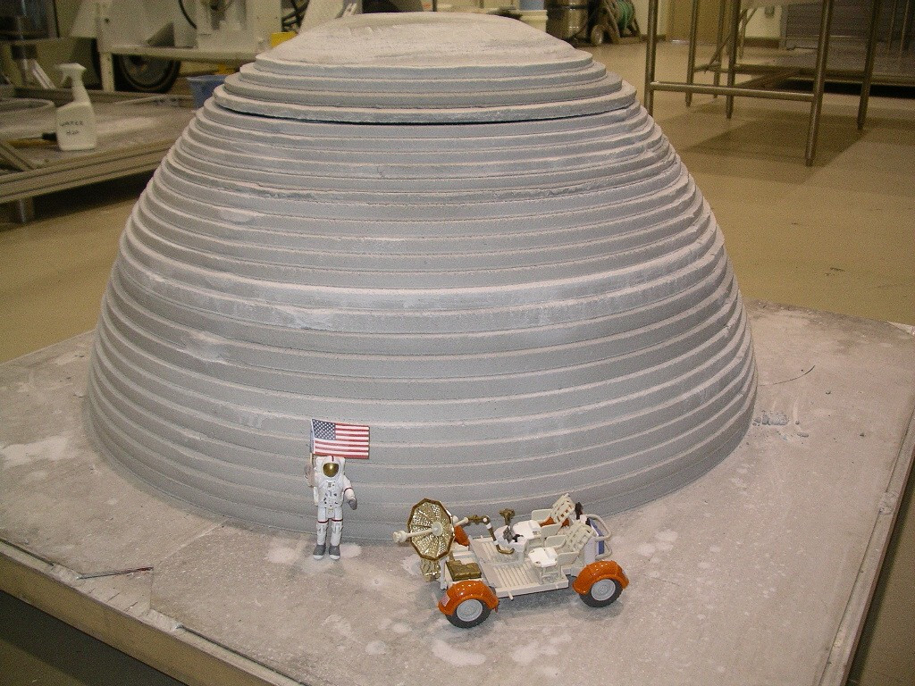Metody pro vytlačování cementové malty poprvé využil již zmíněný íránsko-americký vynálezce, profesor Jihokalifornské univerzity Behrokh Khoshnevis. Jeho tým na technologii, rozšířené o řadu originálních zlepšení a patentované pod názvem Contour Crafting, pracuje již od roku 1997. Tato technologie, která se stala základem stejnojmenné firmy, je založena na originální tiskové hlavě s třemi tryskami a hladítky, které upravují povrch tištěných konstrukcí, na originálním robotickém portálovém systému, nesoucím tiskovou hlavu a další pracovní nástroje, na originálním konstrukčním systému se základem ve vylehčené konstrukci příhradové stěny a na speciálním tiskovém materiálu na bázi cementové malty (obr. 8 až 11). Součástí je i speciální systém, který s využitím robotické ruky osazuje překlady a ve formě srolované lamelové rohože i stropní konstrukce. Technologie Contour Crafting by podle vizualizací a vyjádření prof. Khoshnevise měla umožňovat i vkládání rozvodů domovních instalací, bližší informace bohužel k datu psaní tohoto článku nejsou k dispozici. Technologie prof. Khoshnevise byla v roce 2011 vybrána v soutěži NASA pro realizaci základen na Měsíci a Marsu (obr. 12).