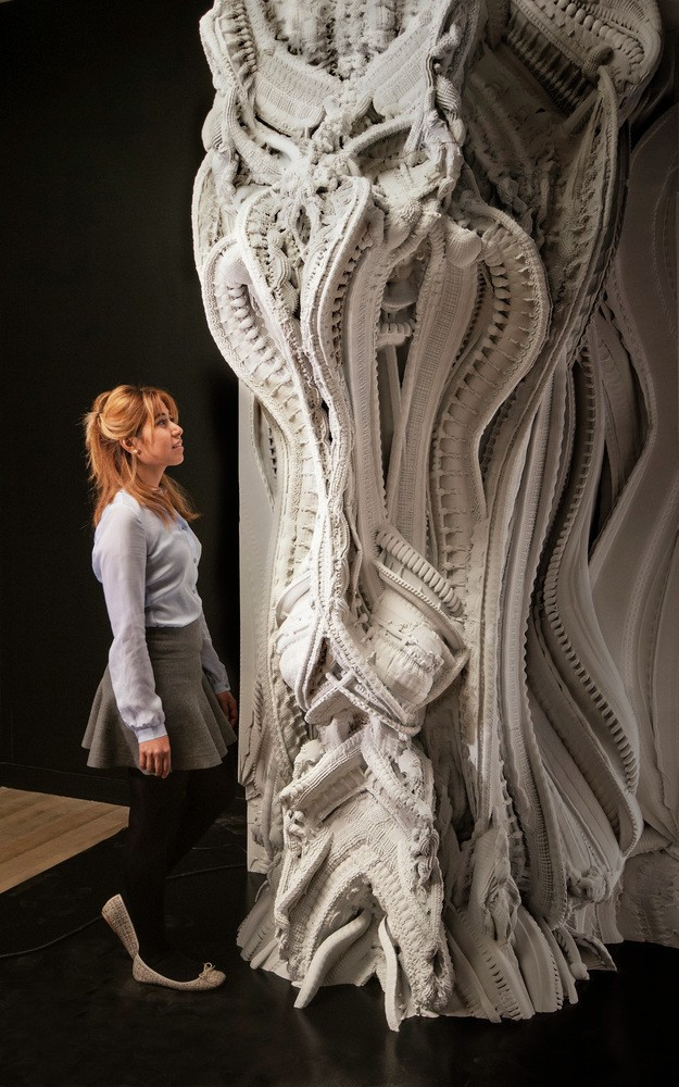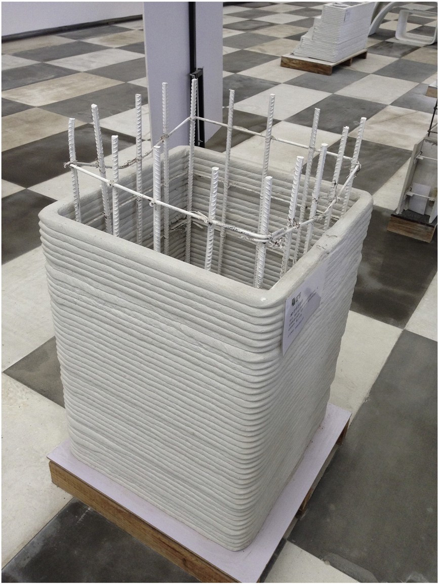 Nevýhodami se může jevit již zmiňované omezení sklonu stěn na cca 45 %, které limituje tvarovou volnost pro architekty, rozlišení tisku v řádu desítek mm a viditelnost vrstev (obr. 16), což u prvků se zvláštními požadavky na povrch vyvolává náklady vlivem dodatečných úprav povrchu dílců. Komplikované statické vyztužování prvků, limitující využití technologie pro ohybem namáhané konstrukce, je řešeno ručním vkládáním výztuže během tisku. Některé výzkumné projekty se snaží tuto skutečnost řešit tím, že využívají 3D tištěnou konstrukci jako ztracené bednění pro klasickou monolitickou betonáž s vloženou výztuží (obr. 17). 3D tištěné ztracené bednění díky tloušťce 3D tištěné obálky řeší minimální krytí výztuže a odstraňuje náklady na bednění a odbednění. Hlavní problém lze kromě obtížnosti dodatečného vyztužování např. vysokých sloupů a zakřivených tvarů spatřovat ve vroubkovaném povrchu takto vyrobené obálky, která nedosahuje kvalit klasicky bedněných prvků. Na principu ztraceného bednění je založen také projekt 3D tištěné sendvičové stěny, vyvíjený na americkém MIT, který spočívá v tisku obálky in situ, složené z dvou stěn z polyuretanu, do níž je ve druhém kroku vložena výztuž a následně je prostor obálky vyplněn monolitickým betonem.25