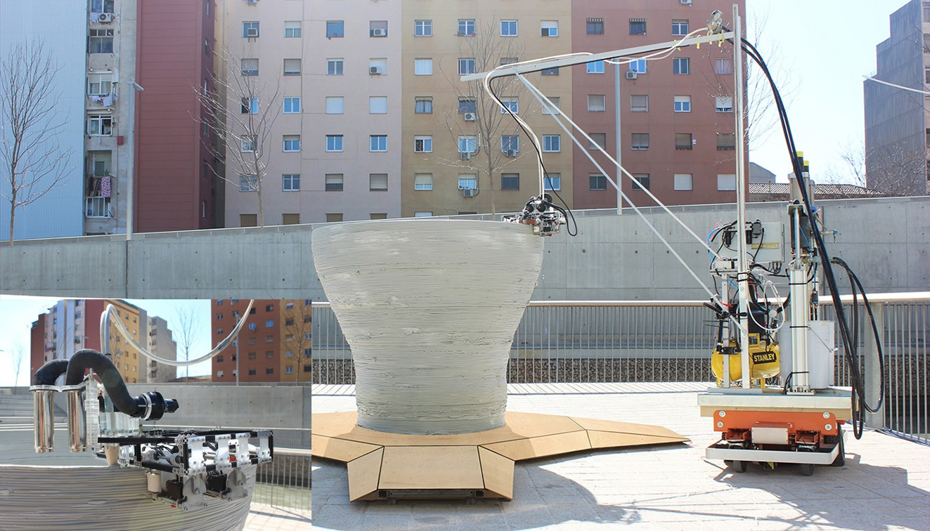 Průkopnickým řešením plně mobilních robotů je projekt univerzity IAAC v Barceloně s názvem Minibuilders (obr. 32), využívající tři různé druhy originálních minirobotů. První má pásový podvozek a je určen pro založení konstrukce. Druhý je založen na čelisťovém podvozku, který pojíždí po již vytvořené stěně. Poslední robot využívá principu podtlakové přísavky a umožňuje vertikální pohyb po vytištěné stěně. Možnosti 3D tisku touto technologií byly úspěšně prezentovány na tisku experimentální konstrukce, o pokračování projektu nejsou bohužel k datu psaní článku žádné dostupné informace.