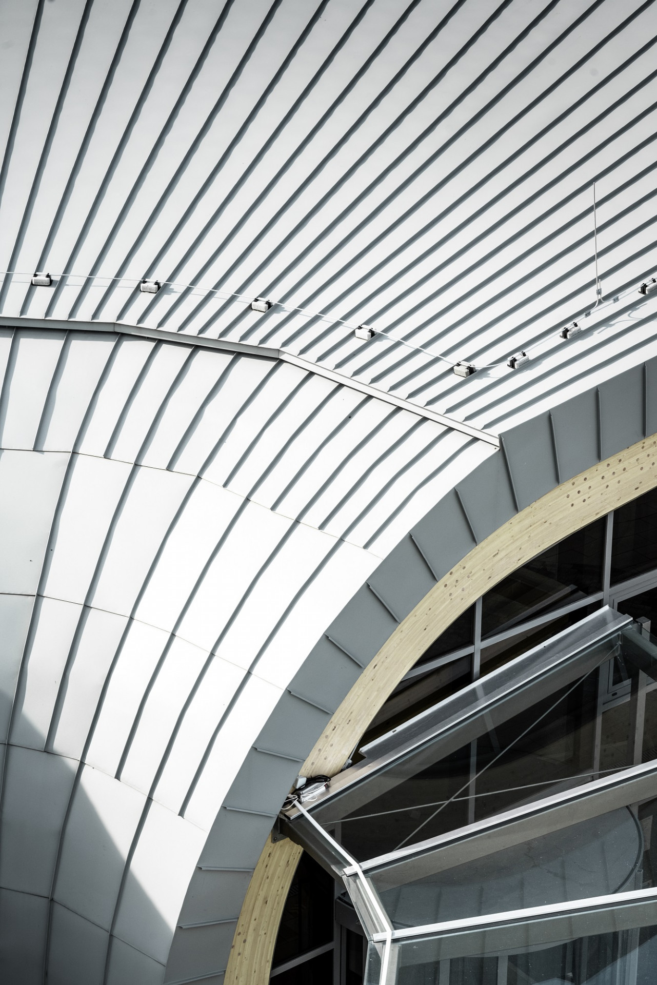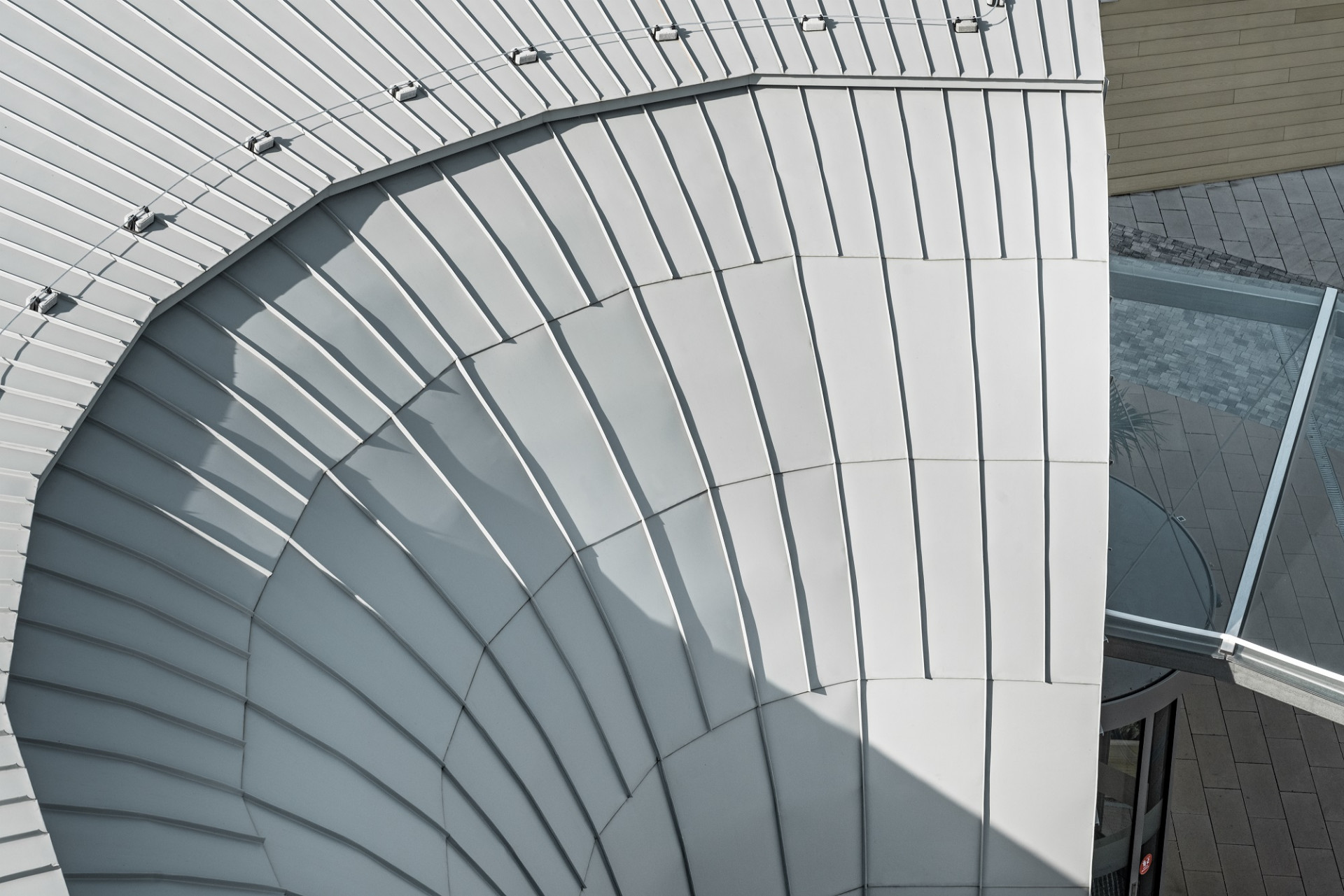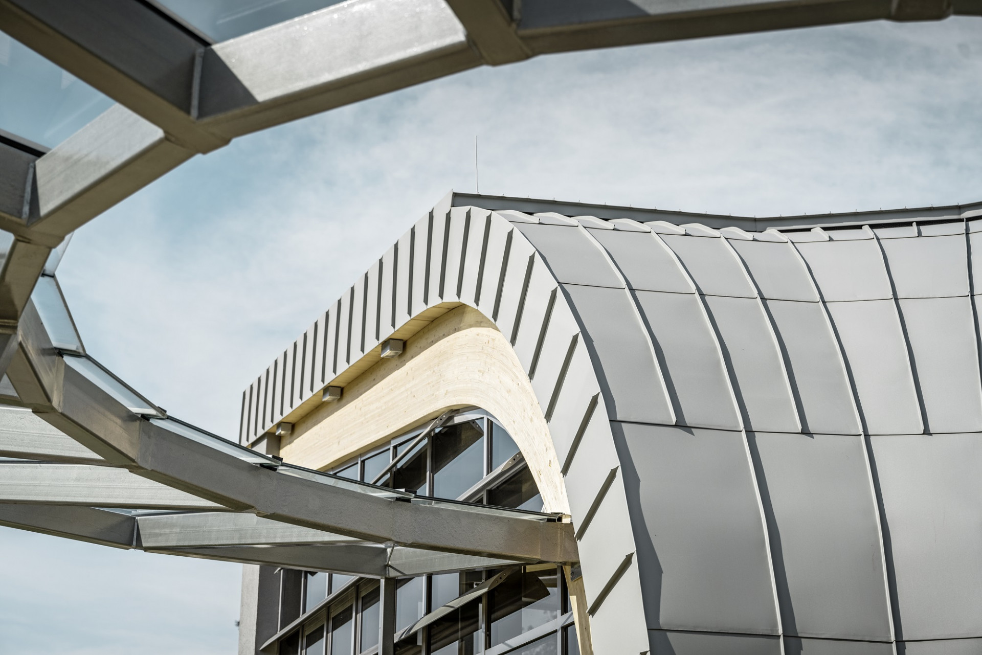 „Hliníkovou střešní krytinu PREFA jsme použili pro tento typ stavby vůbec poprvé. Plechové pásy PREFALZ v odstínu P.10 zinkově šedá a v hladkém provedení, které jsou v Podhájské použity, jsou poddajné, a přitom velmi pevné, odolné a dlouhodobě bezúdržbové. Ideálně se hodí pro daný charakter stavby a ani si dnes už neumím představit, že bychom použili jiný materiál,“ popisuje Igor Bujdák. Současně ale dodává, že v rámci tak komplikovaných tvarů, jaké vstupní objekt v Podhájské má, je kromě kvality materiálu důležitá ještě jedna věc, a to úzká vazba s klempířem a dodavatelem materiálu. „Mnoho atypických detailů vyžadovalo nejenom systémová, ale i individuální a operativní řešení. Vše musí nejenom dobře vypadat, ale také fungovat. A jak víme, jeden špatně provedený detail může dokonale devalvovat kvalitu celého, jinak bezproblémově funkčního systému,“ doplňuje Bujdák. Klempíř Róbert Nyári, který PREFALZ v Podhájské instaloval, se tak musel vypořádat například s netradičním řešením odvětrávání, skrytým pohyblivým kotvením, umožňujícím dostatečnou dilataci materiálu, přechody mezi různými sklony střešní roviny až po zcela vertikální rovinu fasády nebo zaoblením zužujících se šárovaných pásů.