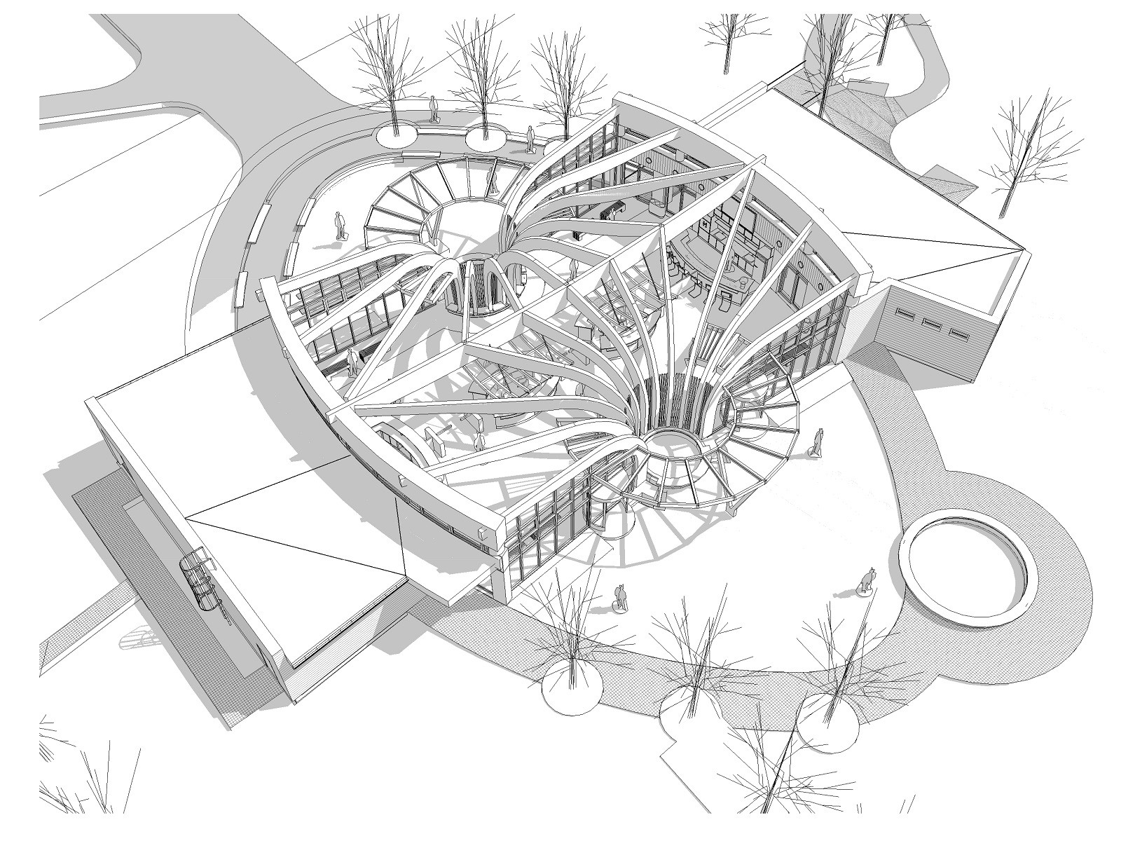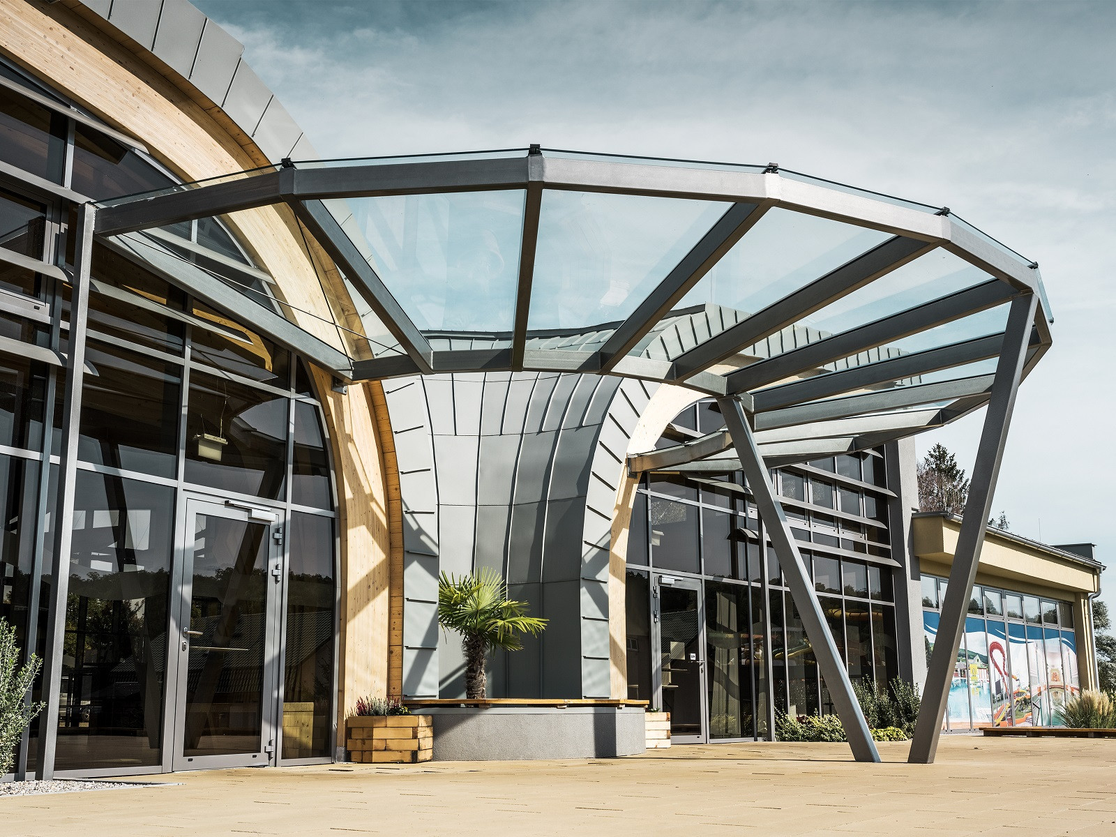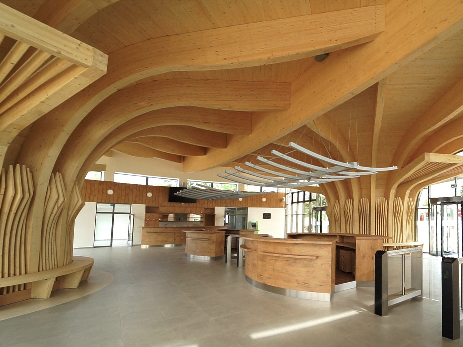 Tvarově náročná je rovněž samotná nosná konstrukce, kterou tvoří obloukové dřevěné lepené vazníky. Interiér haly není nijak rozčleněn a nabízí proto pohledy na organicky působící dřevěnou konstrukci. Pomocné prostory (sklady, šatny pro personál, kotelna a další) se nachází v chytře situovaných bočních křídlech, které na hlavní ponton navazují v oblasti štítových stěn. Nenásilně vstupní halu doplňují, a přitom pomáhají návštěvníky navádět ke vstupu pod symbolický pramen. Samotný vstup, resp. výstup z budovy je z obou stran ještě chráněn předsazenou prosklenou konstrukcí kruhového přístřešku, která zvýrazňuje charakteristickou dynamiku vstupního objektu.