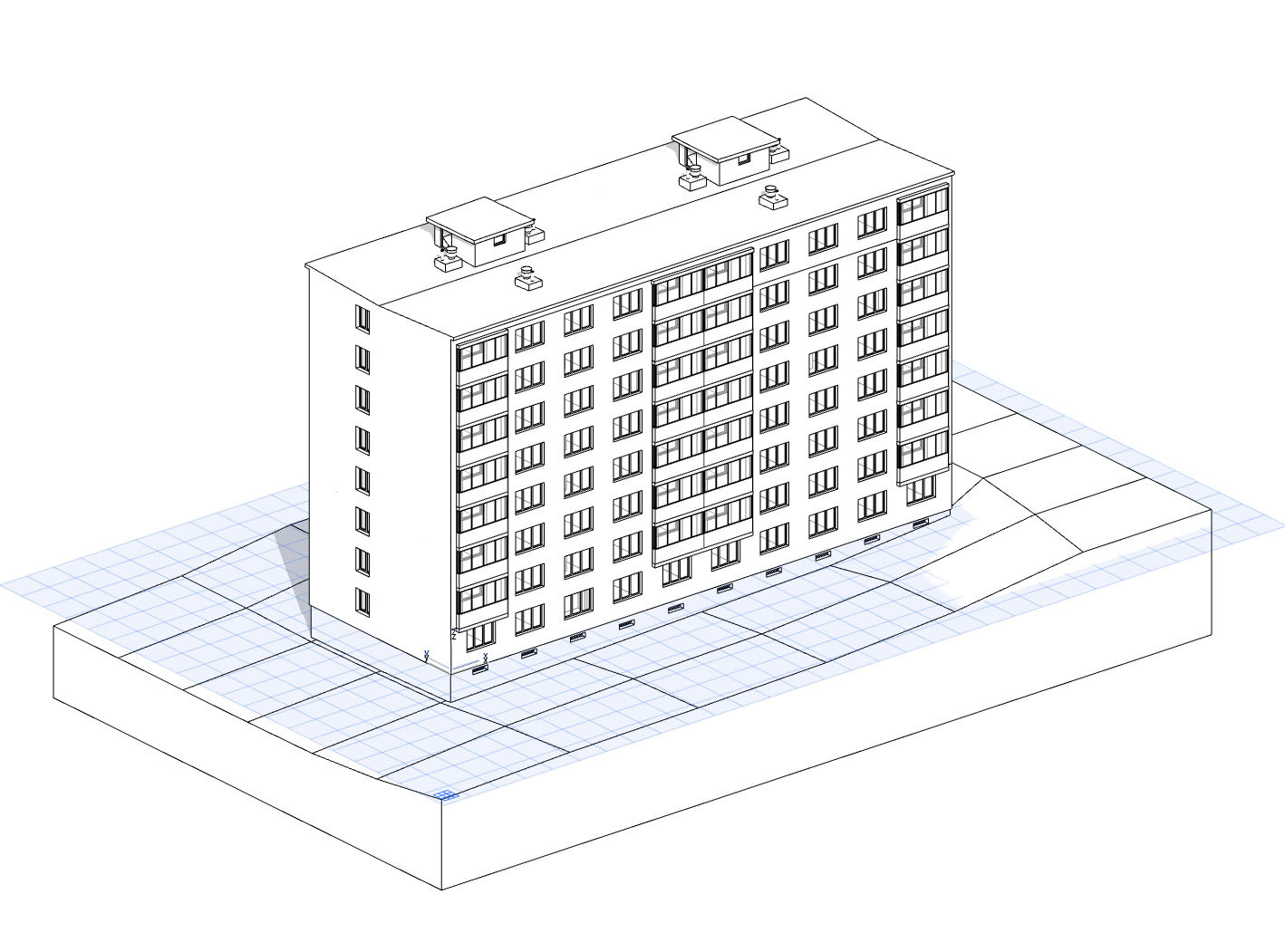 Hlavní objem práce se tedy přesunul z terénního sběru dat do kanceláře k počítači. V první fázi musí geodet zpracovat z nasbíraných dat tzv. mračna bodů, která mu následně poslouží jako podklad pro vynášení modelu stavby. V případě tohoto projektu byl pro vynášení zaměření využit CAD/BIM softwarový nástroj, který umožnil prostorově zkoordinovat celý zaměřovaný objekt tak, aby bylo možné jednotlivé výstupy pasportu generovat ze 3D modelu objektu. To kromě 2D zaměření stávajícího stavu umožnilo předat objednateli komplexní 3D model objektu.