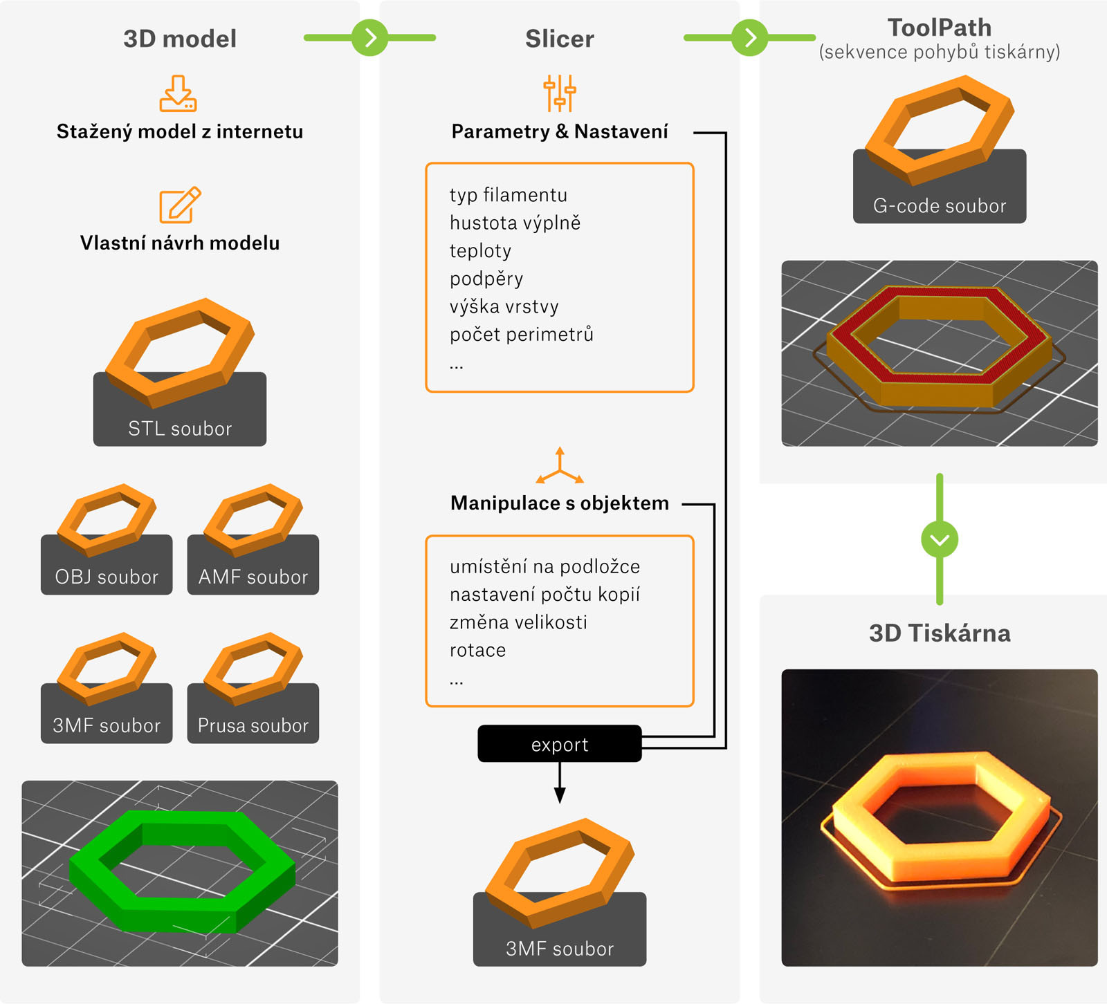 Diagram znázorňuje, jakými kroky prochází 3D model od jeho vzniku až po vytištění.
