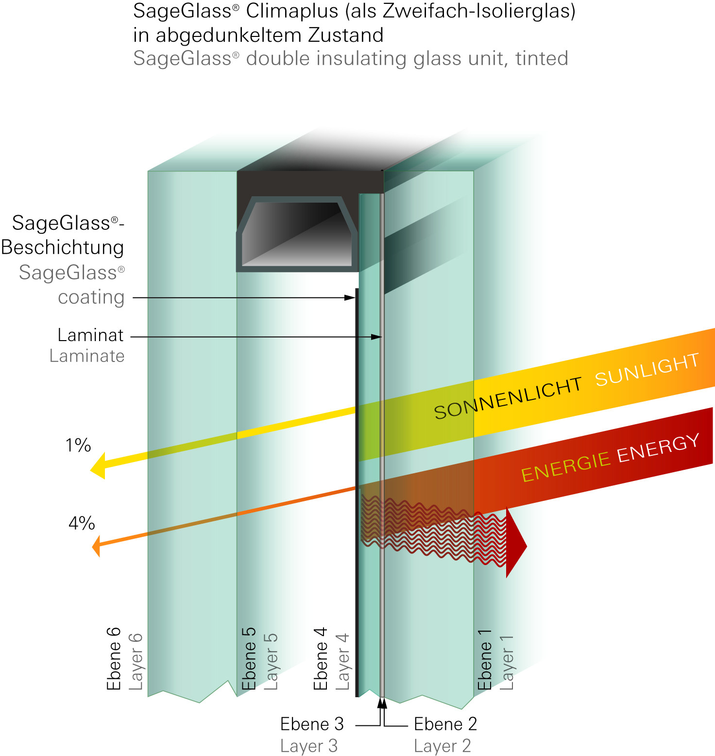 Inovační skleněná technologie SageGlass® je založena na dynamickém skle. Jako takzvané elektrochromické sklo lze SageGlass® dle potřeby naprosto tiše a elektronicky ztmavit či zesvětlit – buď automaticky, stisknutím tlačítka nebo přes dotykovou obrazovku. Zcela individuálně tak lze regulovat přívod denního světla, slunečního tepla a stínění. Neomezený výhled směrem ven zůstává zachován u každého stupně ztmavení. Jelikož lze upustit od běžných mechanických slunečních clon, mohou architekti vytvářet zcela nové designové fasády. SageGlass® se tak stává nejen ekologickou alternativou žaluzií, lamel a rolet, ale i zárukou příjemného pokojového klima. Přesvědčuje především svou jednoduchou estetikou. Světelnou prostupnost sluneční clony Schüco s technologií SageGlass® lze regulovat ve čtyř stupních mezi 1 % až 60 %. Tato redukce snižuje vedle oslňujícího slunečního záření také prostup horka. SageGlass® tak vytváří světlem prosvícené prostory a příjemné pokojové klima i za vysokých venkovních teplot.