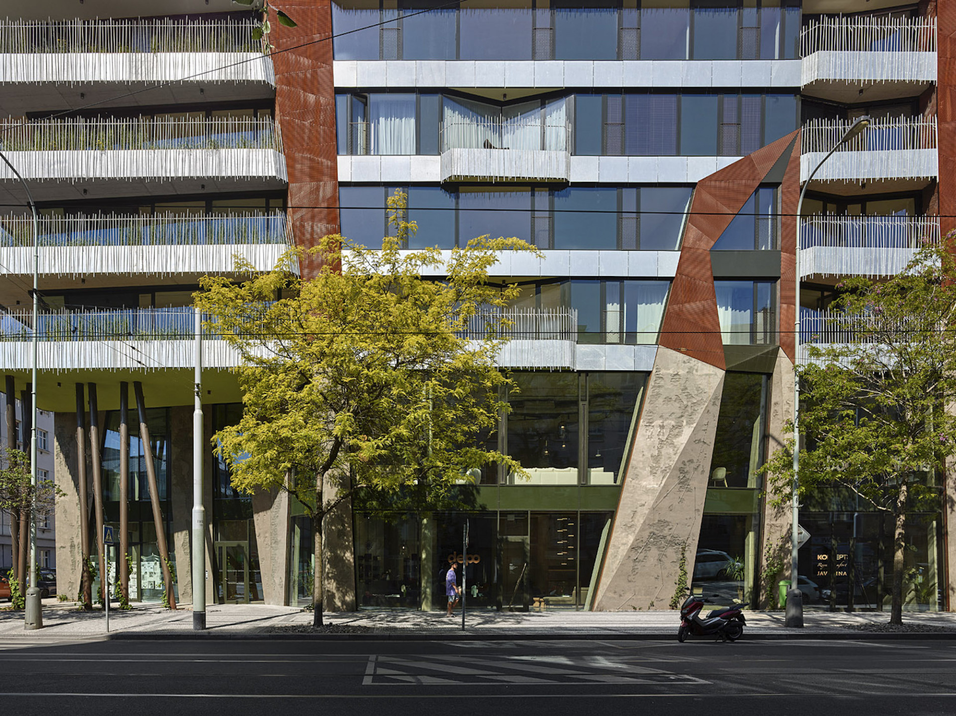 Na fasádě výrazně vystupuje zrezlý cortenový obklad ostrých geometrických tvarů. Podlaží jsou na fasádě výrazně vykreslená pozinkovanými pásy, z nichž vyrůstá organický les roxorových prutů zábradlí, lemujícího balkony a terasy.