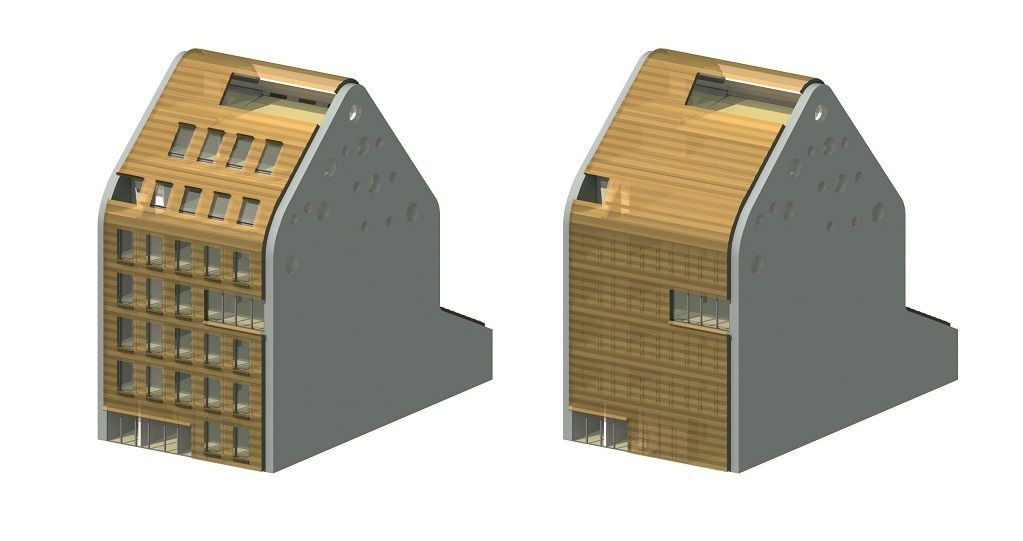 Původní plášť byl odstraněn a nový posunut o dva a půl metru směrem do ulice, aby byla zachována uliční čára. Betonovou konstrukci pokryl nový povrch ze skla a perforované slitiny mědi. Stavba se tak zabalila od jednoho konce přes druhý, přechod mezi stěnou a střechou je nerozpoznatelný. Jediné, co objekt vymezuje jsou dvě zaoblené boční stěny. Měděnou pokrývku kopírují, ale jejich fasáda má zcela jiný charakter. Je bez logiky a kulatá okna tvoří nahodilý vzorek.