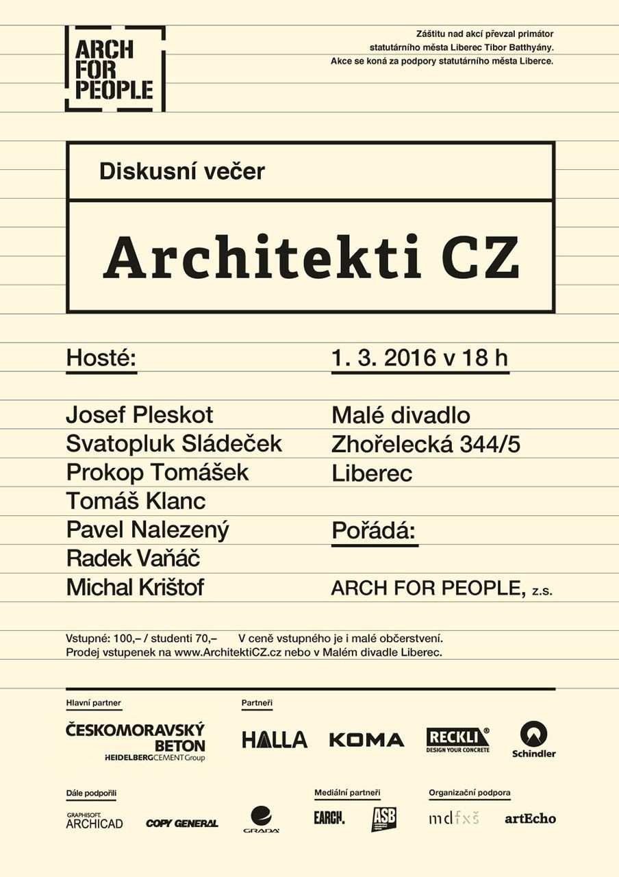 Večer, který vzniká za podpory statutárního města Liberce, volně navazuje na knihu dvaceti rozhovorů „Architekti CZ“, jejímž autorem je moderátor diskusního večera Jaroslav Sládeček. Již druhá ze série panelových diskuzí ARCHITEKTI CZ se uskuteční 1. 3. 2016 od 18.00 hodin v Malém divadle v Liberci. Záštitu nad akcí převzal primátor statutárního města Liberec Tibor Batthyány.