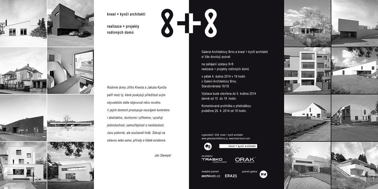 V Galerii Architektury Brno bude od 5. dubna do 5. května 2014 k vidění výstava 8 + 8, která představí 16 rodinných domů navržených architekty ze studia knesl + kynčl architekti.