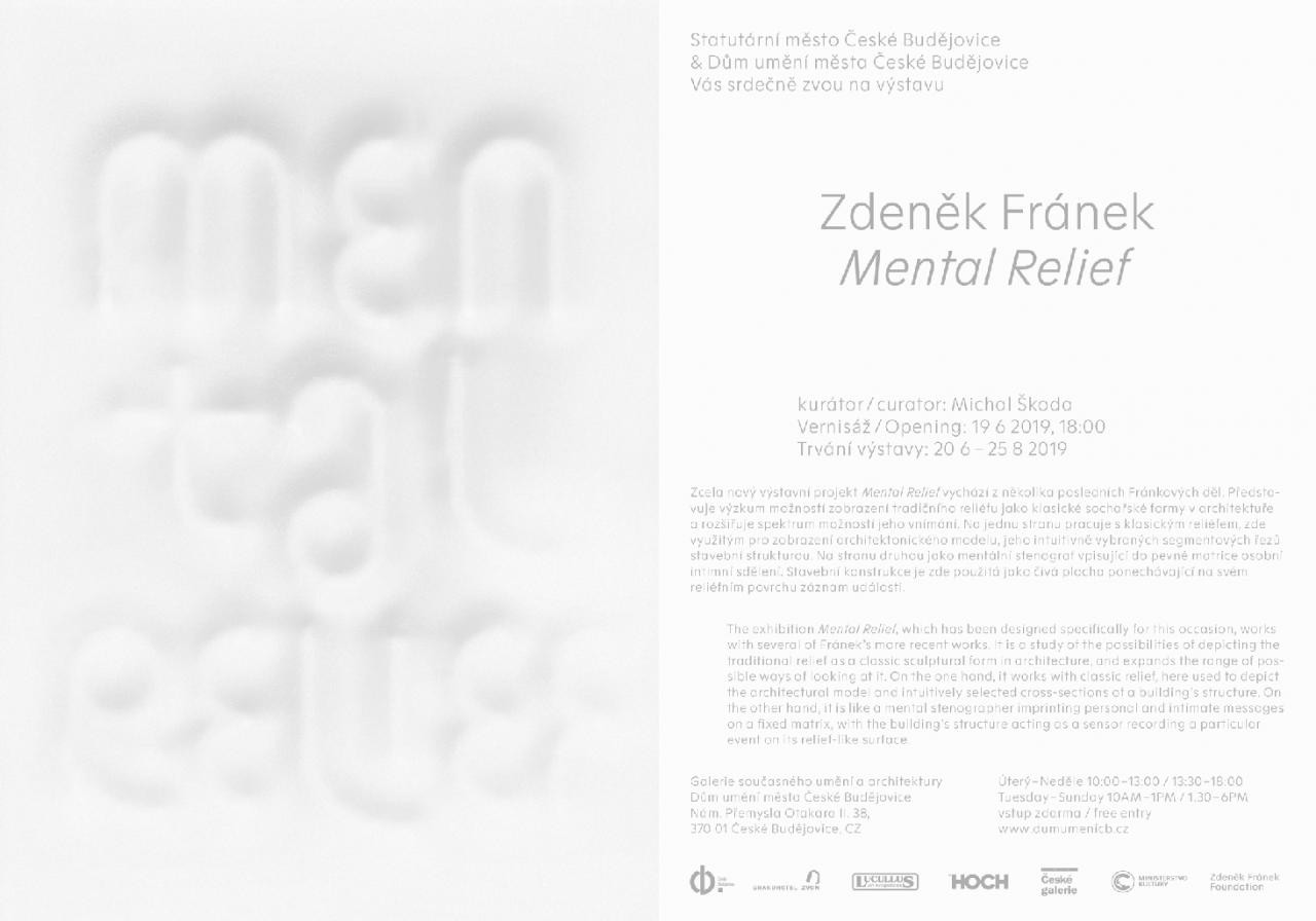 Zcela nový výstavní projekt MENTAL RELIEF vychází z několika posledních Fránkových děl. Představuje výzkum možností zobrazení tradičního reliéfu jako klasické sochařské formy v architektuře a rozšiřuje spektrum možností jeho vnímání. Na jednu stranu pracuje s klasickým reliéfem, zde využitým pro zobrazení architektonického modelu, jeho intuitivně vybraných segmentových řezů stavební strukturou. Na stranu druhou jako mentální stenograf vpisující do pevné matrice osobní intimní sdělení. Stavební konstrukce je zde použitá jako čivá plocha ponechávající na svém reliéfním povrchu záznam události.