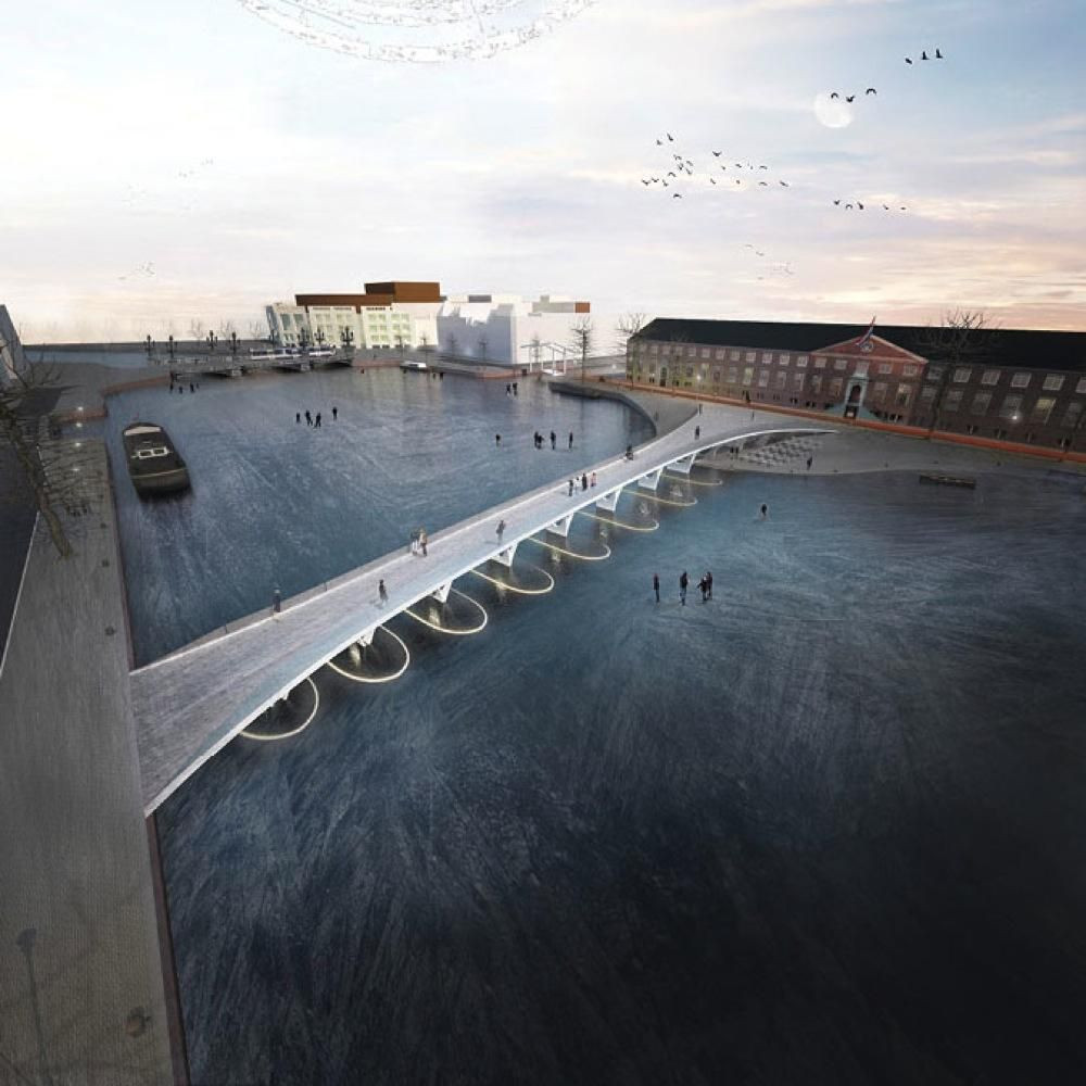 Z místa před skromným vstupem do Ermitáže Amsterdam se naskýtají nádherné výhledy na řeku Amstel, ale chybí zde urbánní prostor, kam by se mohly uchýlit davy návštěvníků. Tento most je nejen dalším propojením s Ermitáží, ale zároveň i novou dominantou, která vytváří okolo hlavního vchodu nové náměstí se službami.