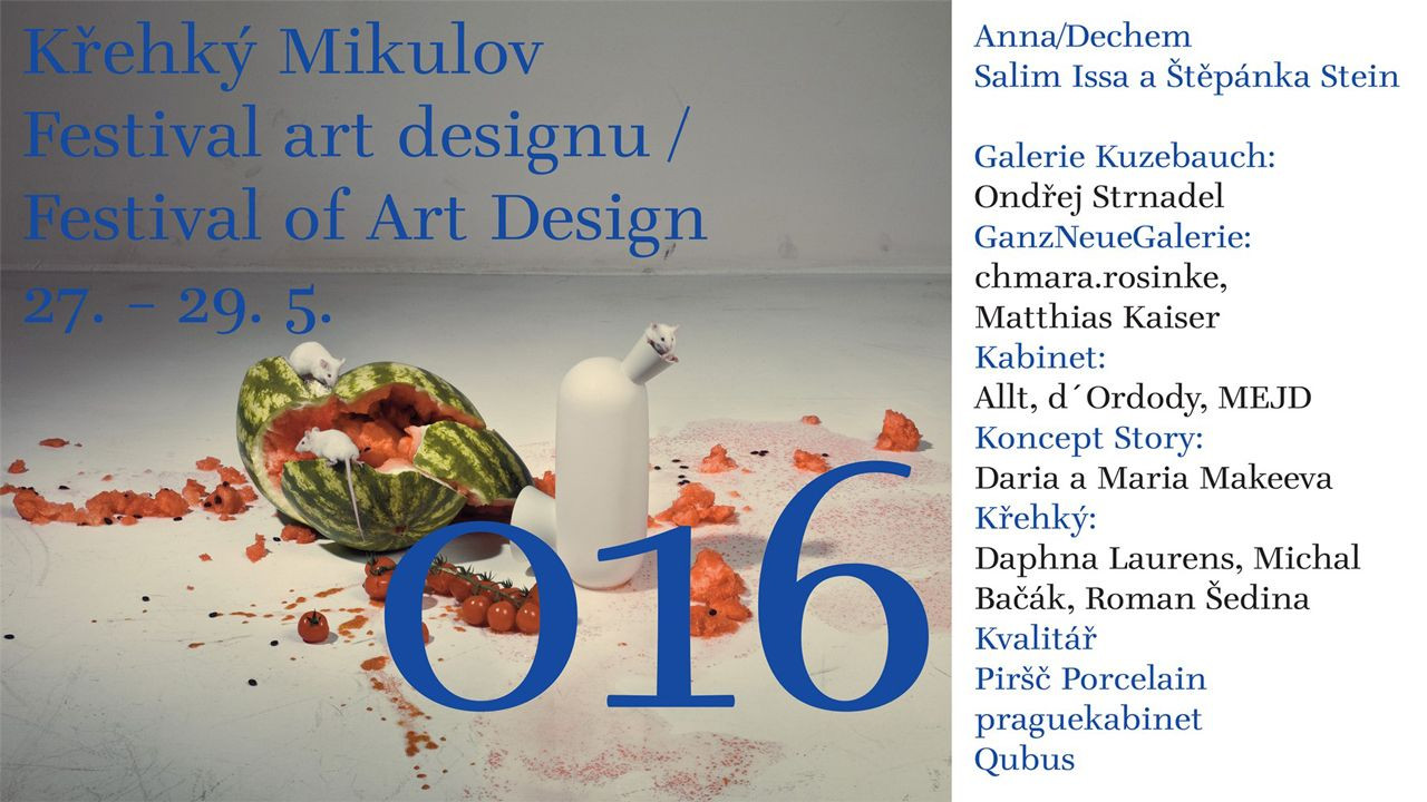 Výstavy budou umístěné především v prostorách zámku Mikulov a v zámecké knihovně. Hostitelská galerie Křehký z Prahy, představí hned tři autory. Známé holandské duo Daphna Laurens navrhlo pro Křehký přátelský domácí objekt, který může sloužit jako karafa, s českým názvem Objem. „Objem svým veselým elegantním vzhledem oživí jakoukoliv společenskou událost,“ říká dvojice designérů. Objem bude doplněný o grafické plakáty pracující s motivem objektu od Tomase Nilssona, grafického designéra ze studia Pony z Basileje. Roman Šedina představí vázy KA, „novodobé veduty, prameny pro poznání historického kontextu“ jak o své kolekci říká. A kmenový designér galerie Křehký, Michal Bačák, představí dvě nové porcelánové mísy Živa a C3PO, vycházející z estetiky vloni premiérovaných mís Folk. Nové Bačákovy kusy tentokrát nebudou limitované edice, ale půjde o sériově vyráběné produkty.
