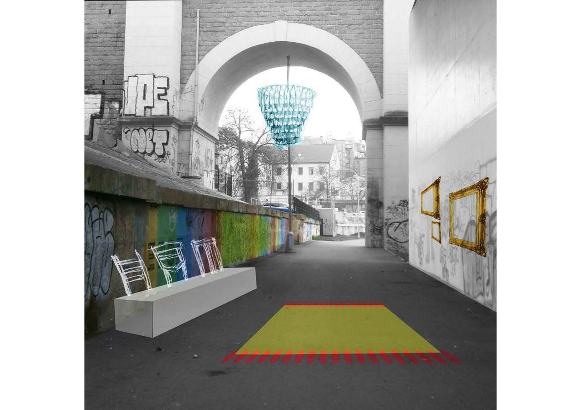 Školní náměstí (autor podnětu: Romana Vojtíšková autoři návrhu úprav: Markéta Škopková, Kateřina Kmecová)Na Školním náměstí ve Skvrňanech, návsi někdejší vesnice, se z původních staveb zachovala pouze budova školy. Plocha náměstí byla v období komunismu necitlivě narušena kapacitní silnicí, pod kterou vznikl dnes nevyužívaný podchod. Ten se v září promění v netradiční venkovní, ale přesto krytý pobytový prostor s různými typy mobiliáře, který poslouží nejen žákům a studentům místních škol. Obě strany podchodu s přilehlým veřejným prostorem pak propojí výrazná barevná malba.