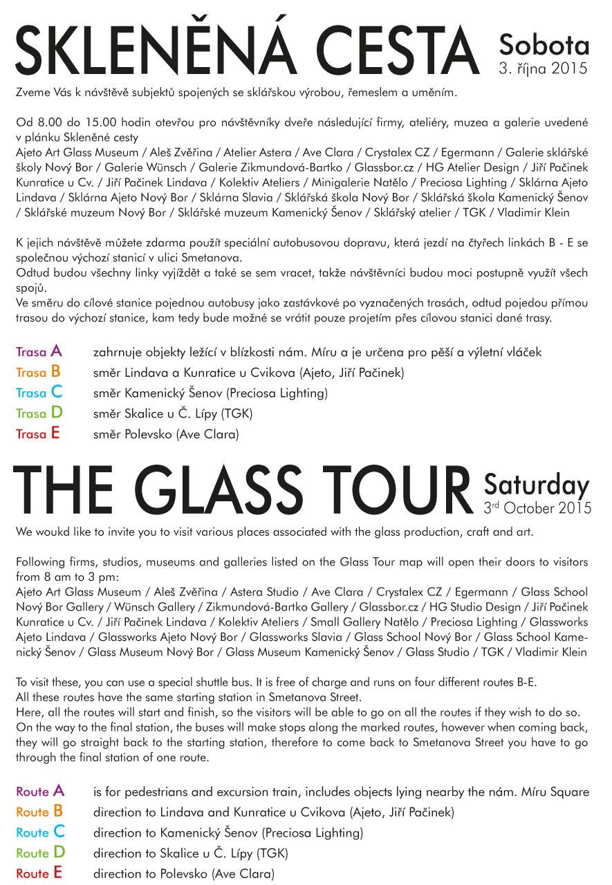 Po „Skleněné cestě“ bude možno se vydat pěšky, výletním vláčkem nebo speciálními autobusy. K dispozici budou orientační mapky s vyznačením jednotlivých okruhů a tras. Jedna trasa je určena pro pěší a provede zájemce po ateliérech v blízkosti náměstí Míru, kde je navíc na celý den připraven program pro malé i velké. Na dalších čtyřech trasách budou mít návštěvníci možnost se zdarma přepravit do Lindavy a Kunratic u Cvikova, do Skalice u České Lípy, do Kamenického Šenova nebo na Polevsko a využít otevřených dveří v pořadatelských a partnerských firmách.