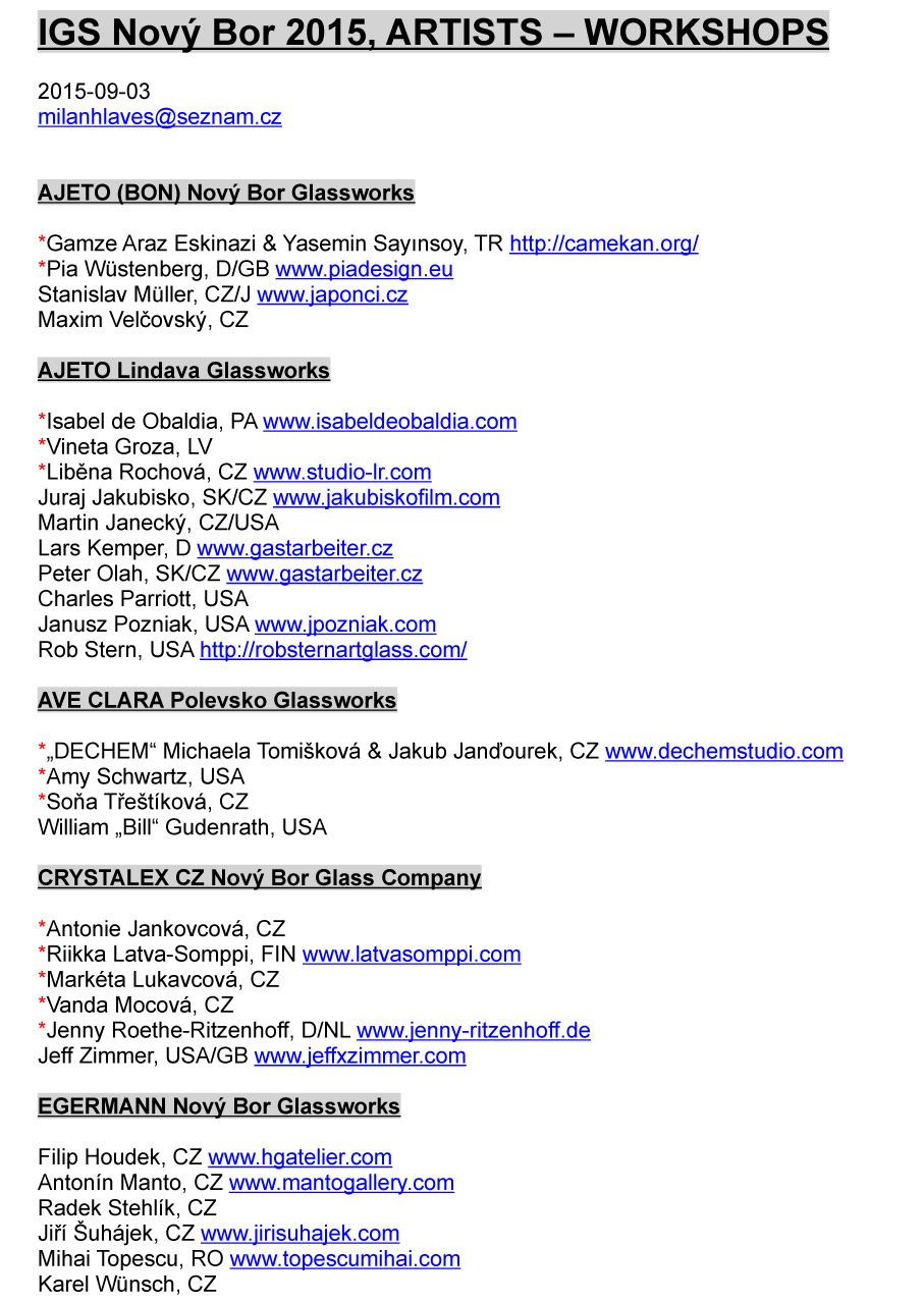 V rámci IGS 2015 můžete od čtvrtka do neděle nahlédnout do renomovaných sklářských provozů (např. Pačinek Glass, Ajeto, Preciosa Lighting, Egermann, Ave Clara, TGK, Crystalex, Sklárna Slavia) a sledovat při práci přední české i zahraniční umělce a designéry, navštívit muzea, sklářské ateliéry, galerie se zaměřením na sklo, doprovodné výstavy a přednášky, hudební akce.
