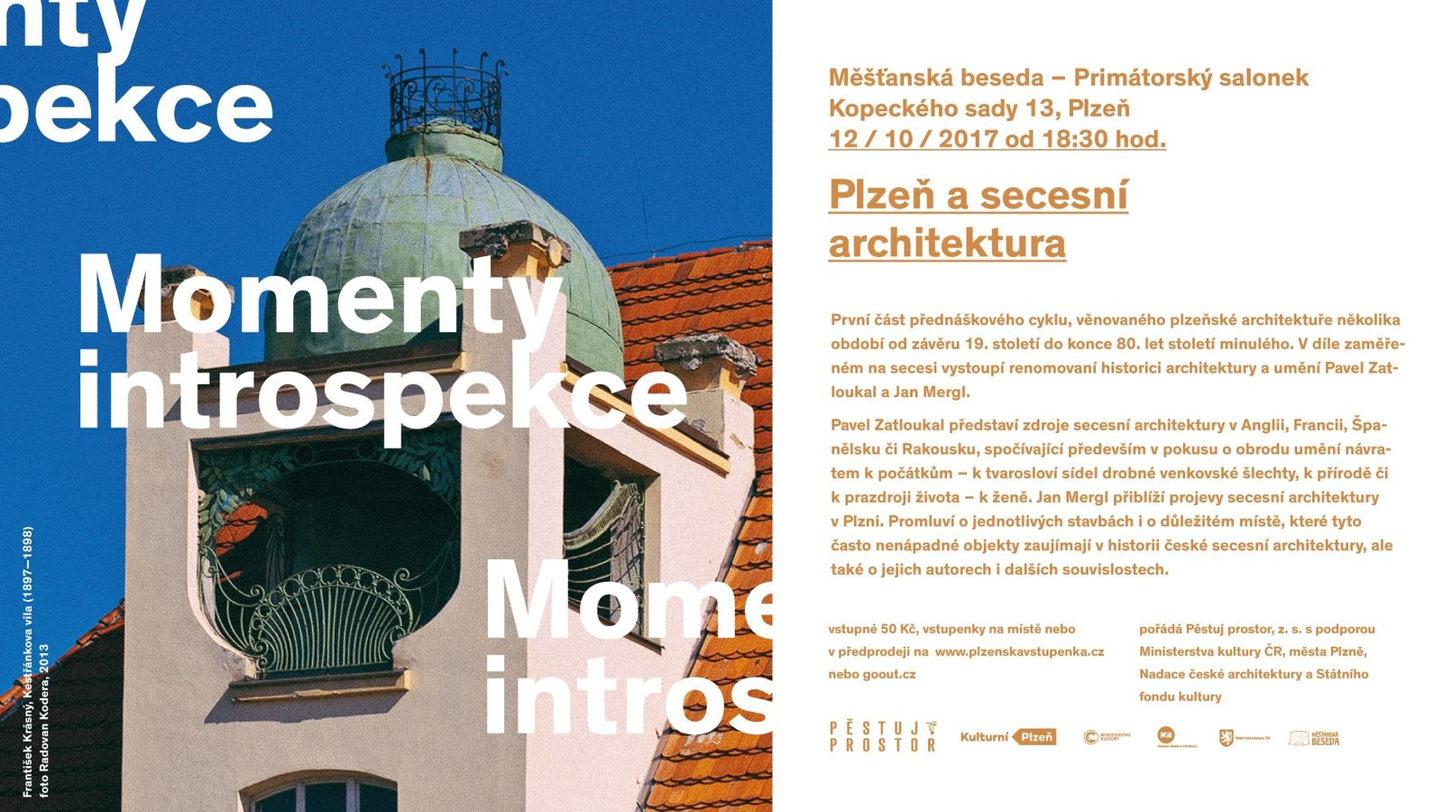 Fenomén plzeňské secese, moderny, tzv. sorely či panelové výstavby představí vždy dvě osobnosti z řad respektovaných historiků či teoretiků architektury, architektů či sociologů. Zatímco jeden z hostů bude místním odborníkem, druhý bude mít celorepublikovou působnost a nabídne potřebné souvislosti a srovnání. V prvním díle, který se uskuteční 12. října 2017 od 18:30 hod. v Měšťanské besedě v Plzni a který se soustředí na secesní architekturu Plzně v českém, potažmo evropském kontextu, vystoupí renomovaní historikové architektury a umění Pavel Zatloukal a Jan Mergl.